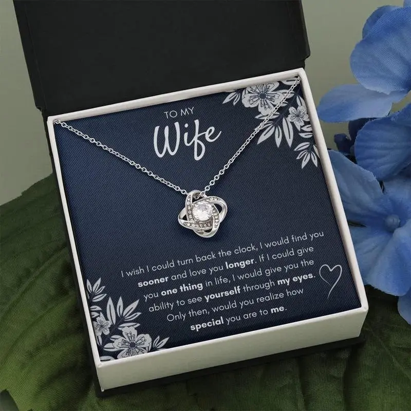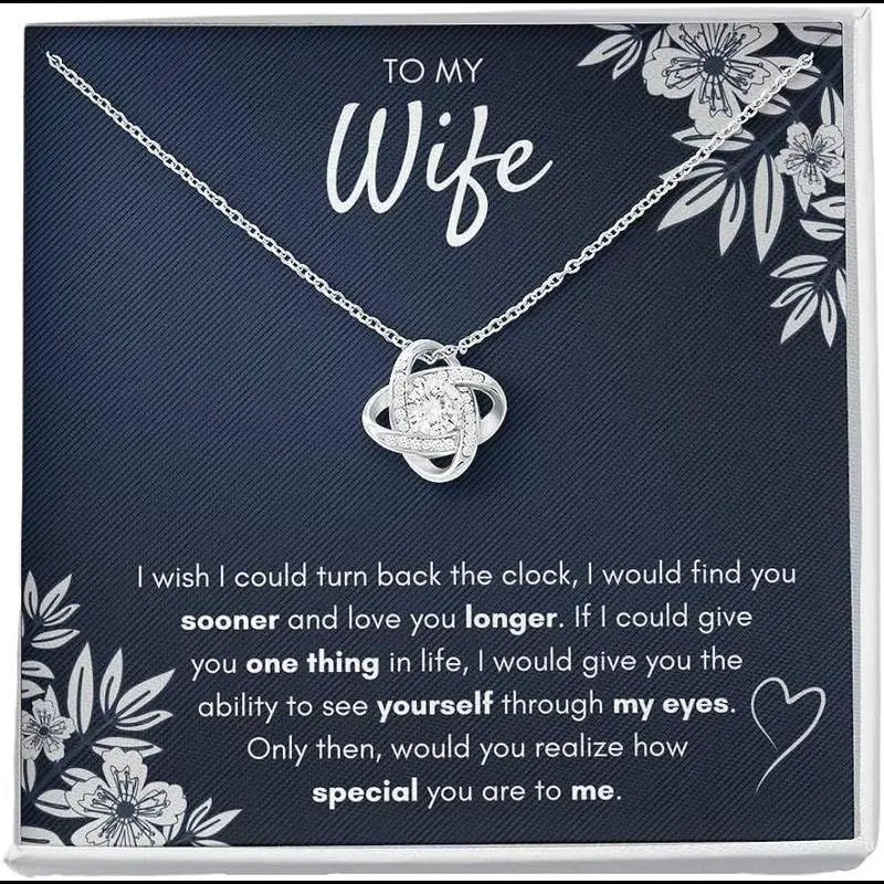 To My Wife, I wish I could turn back the clock, I would find you sooner and love you longer. If I could give you one thing in life, I would give you the ability to see yourself through my eyes. Only then, would you realize how special you are to me./TIMELESS KEEPSAKE GIFT: Our jewelry comes with a premium quality gift with a special message. This piece makes a unique and thoughtful necklace gift for your wife, fiancee, future wife boyfriend, family. Includes gift box./INSPIRATIONAL MESSAGE CARD: Message Card Jewelry represents an unbreakable bond between two souls. This symbol of eternal love is a forever favorite and trending everywhere. Surprise your loved one with this gorgeous gift today! It is not a small item but a big surprise for your love!/MATERIALS & SIZE: 14k White Gold plated over stainless steel 6mm round cut cubic zirconia stone 18"-22" adjustable cable chain necklace Lobster clasp attachment