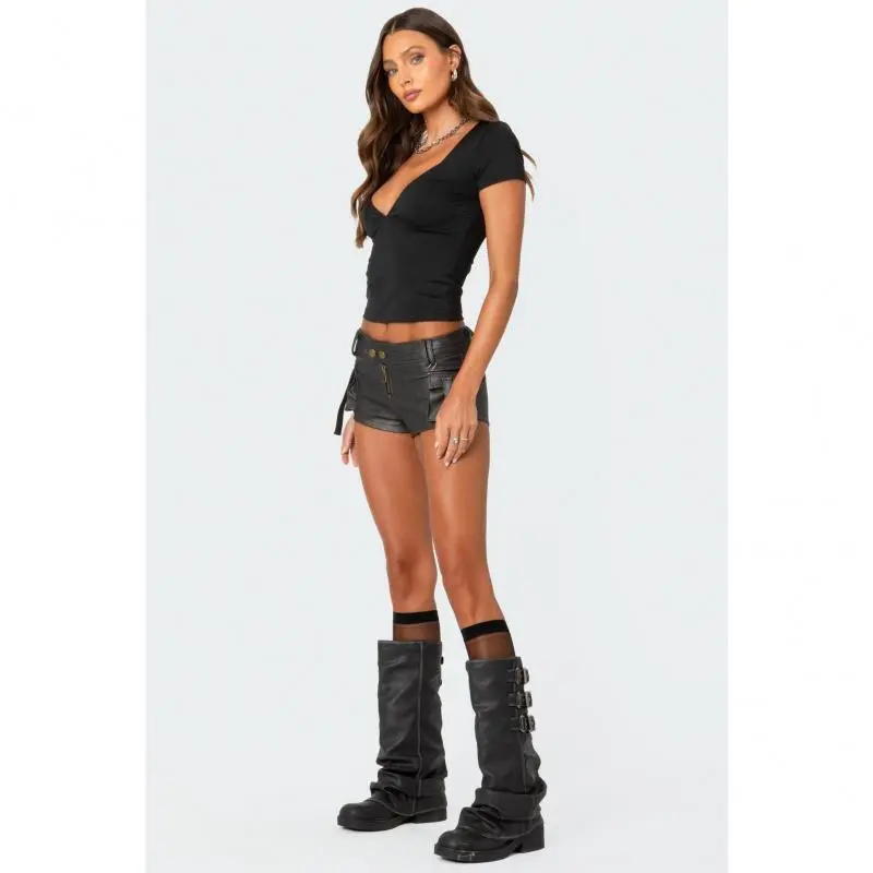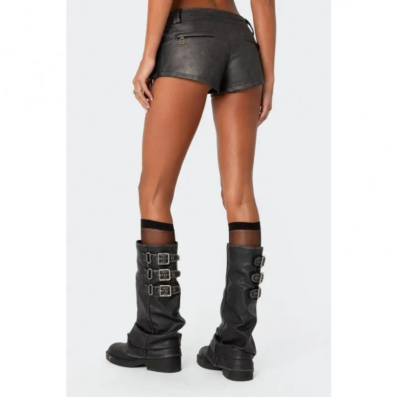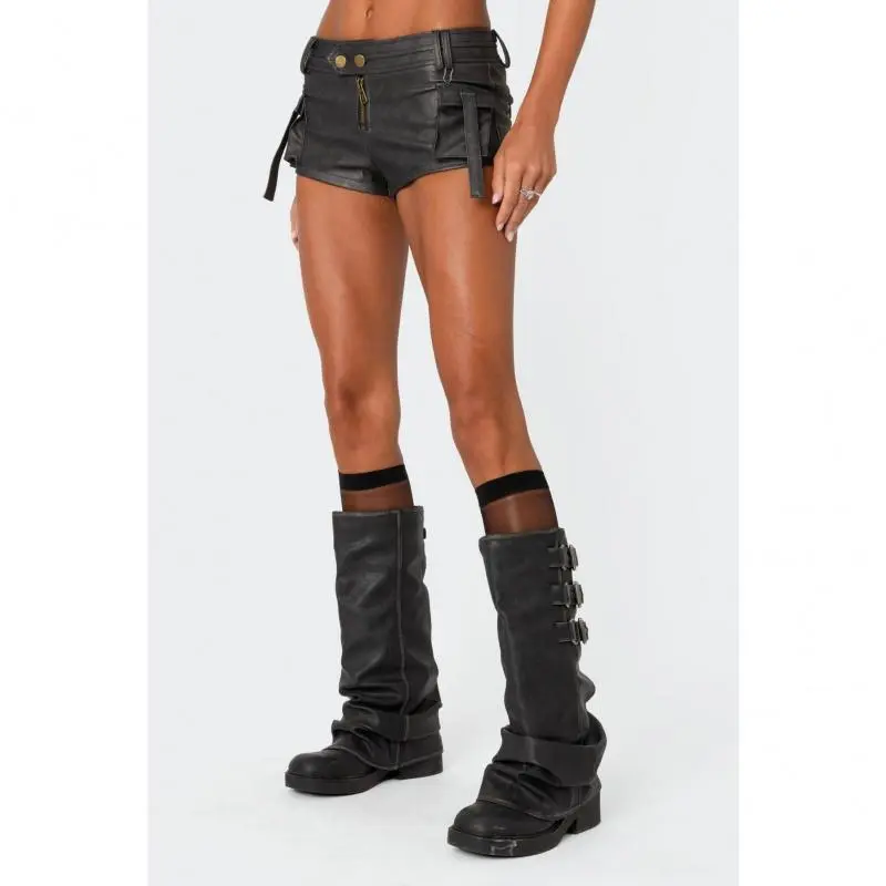 🌟 Washed Faux Leather Micro Cargo Shorts 🌟 Style & Design: Fit & Size: These washed faux leather micro cargo shorts offer a stylish and versatile look. Made from polyurethane and polyester, they are easy to care for. The model wears size S, with an inseam of 1.8 inches. Perfect for those looking for a comfortable and fashionable bottom.