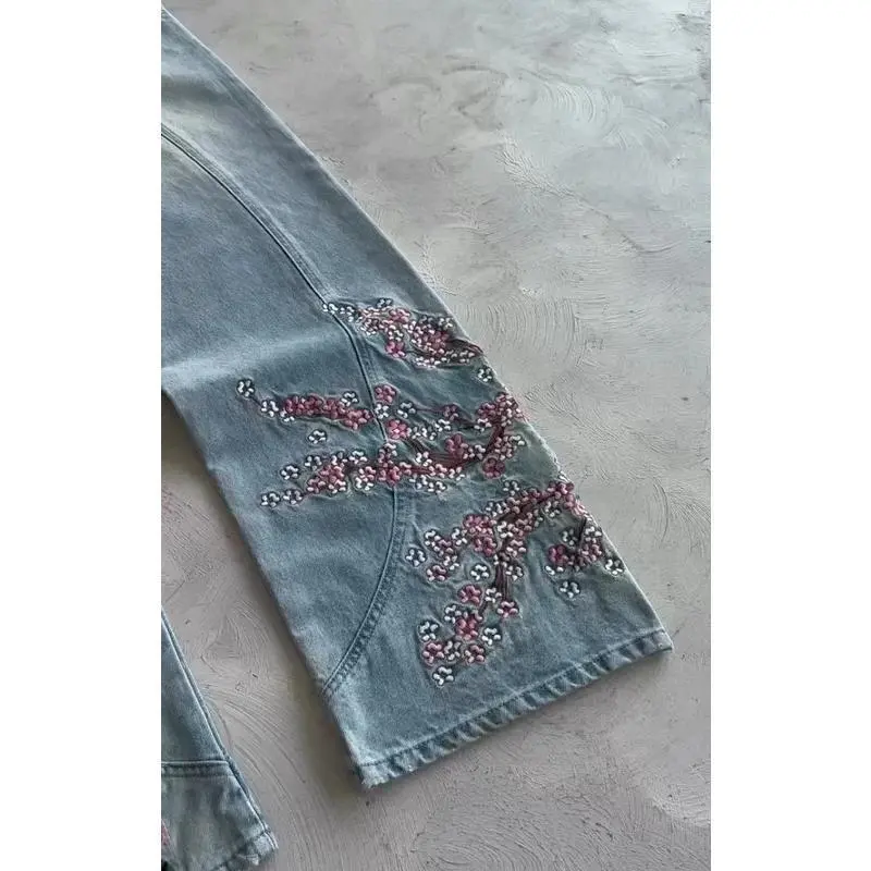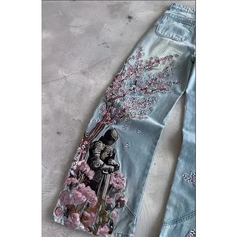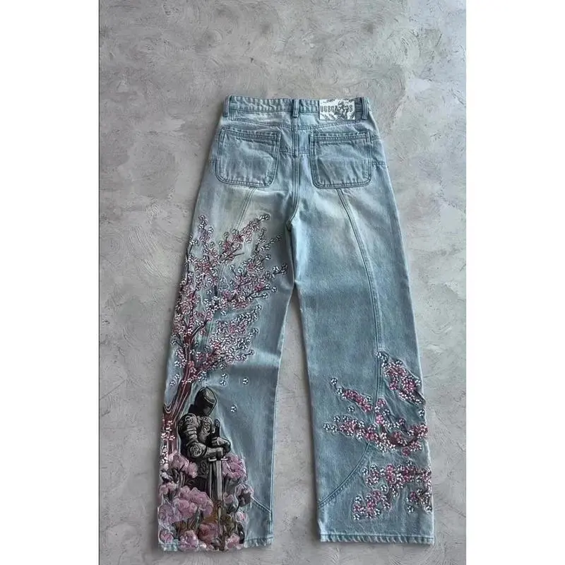 MenWomenCherryBlossomKnightAllEmbroideryDenimPantsY2kVintageBaggyStreetStraightJeansHighWaistedWashedBlueJean Menswear