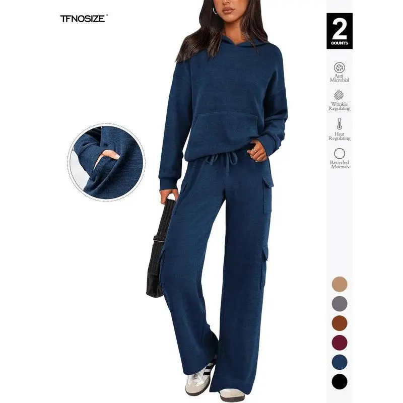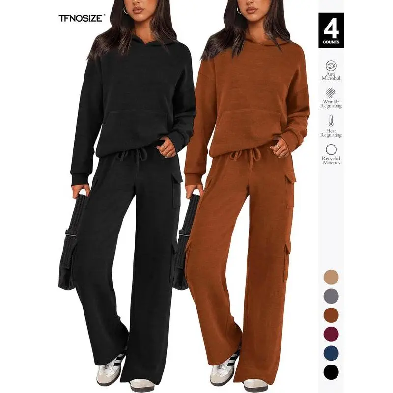 【Two-piece outfit】: Includes a hooded sweatshirt and wide leg cargo pants, offering a complete and coordinated look. 【Waffle knit fabric】: Crafted from a textured waffle knit that enhances warmth while providing breathability for daily wear. 【Wide leg fit】: Features wide leg pants that allow for easy movement, combining both functionality and comfort throughout your day. 【Hooded feature】: The hooded sweatshirt adds an extra layer of warmth and a trendy touch to your loungewear ensemble. 【Seamless fit】: Designed with a fitted cut to flatter your silhouette, making this set suitable for at-home relaxation or outings.