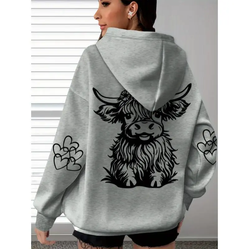 [Cozy | Highland Cow] Soft Oversized Cozy Hoodie | Women's Long Sleeve Pullover | Brown Polyester Highland Cow Print & Paw Heart Design Casual Wear for Everyday Comfort Can be used with a raincoat