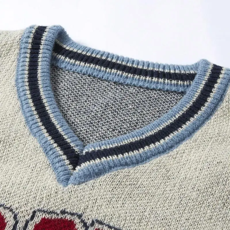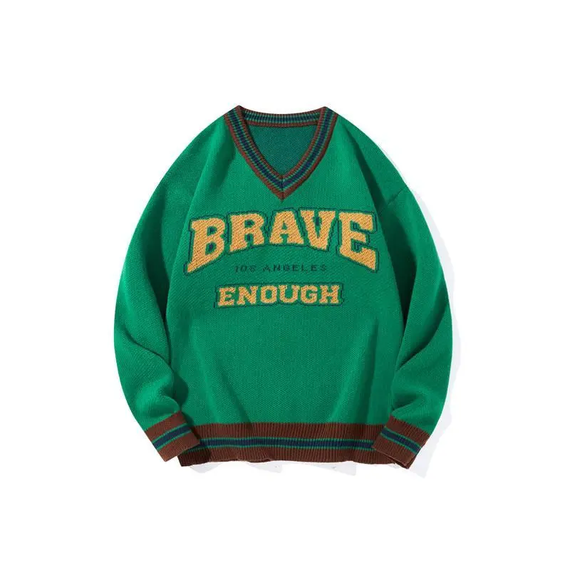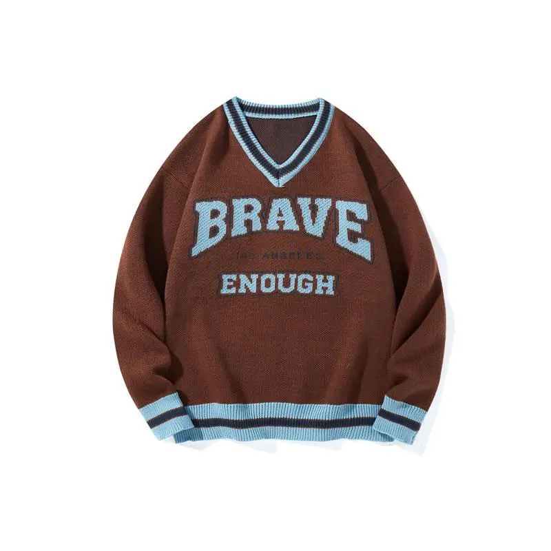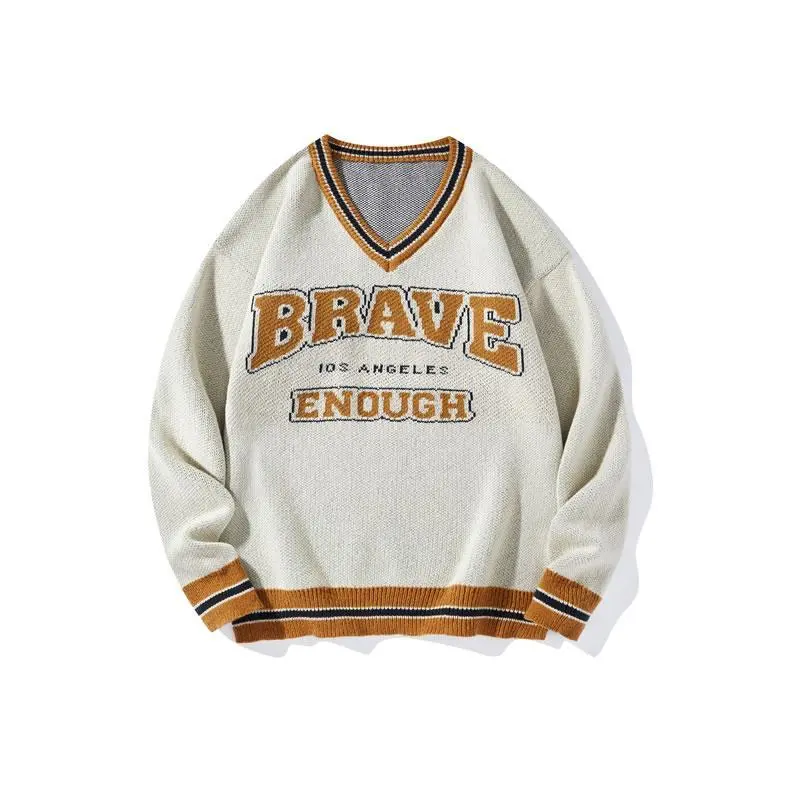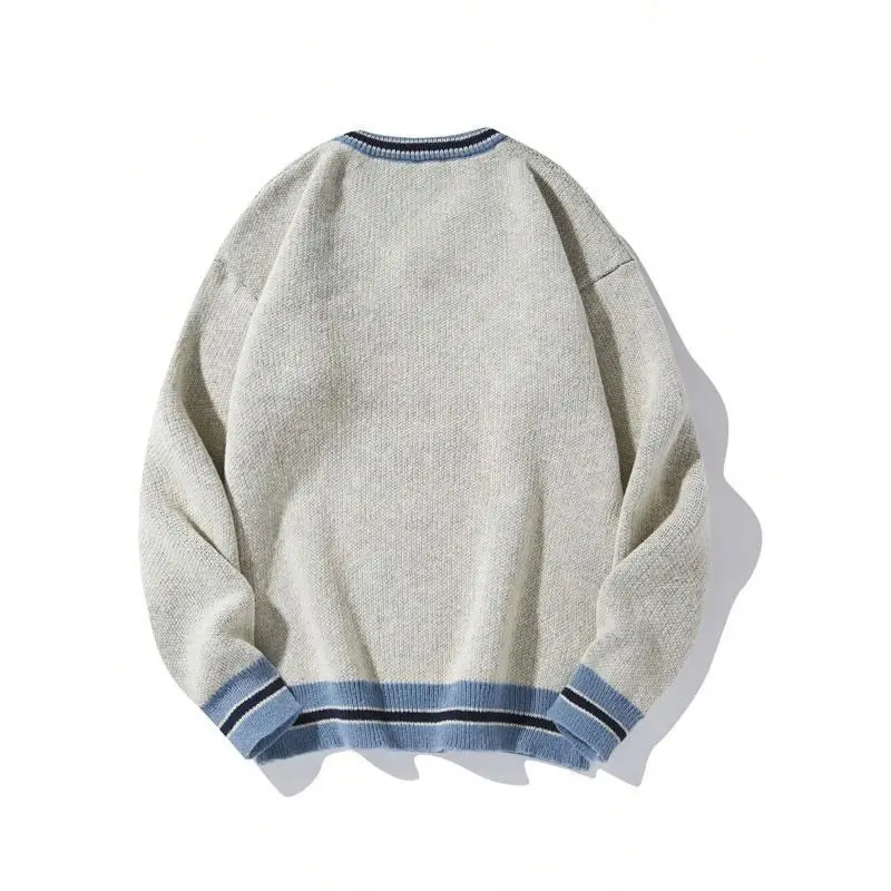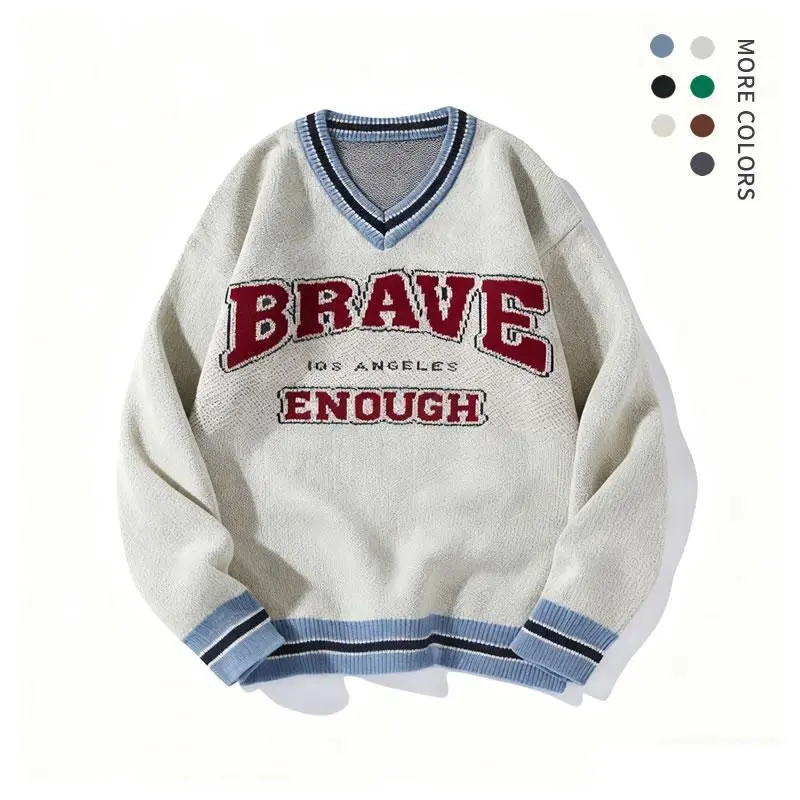 Men's V-neck pullover sweater, loose casual long sleeved shirt, seasonal basic shirt, fashionable men's university style neutral sweater, men's pullover sweater, knitted printed jacquard letters, versatile colors