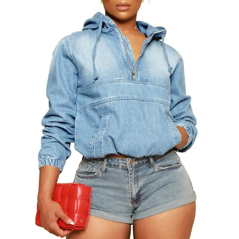 Women's Half Zip Denim Hoodie Pullover Jacket Jean TopsYLxV