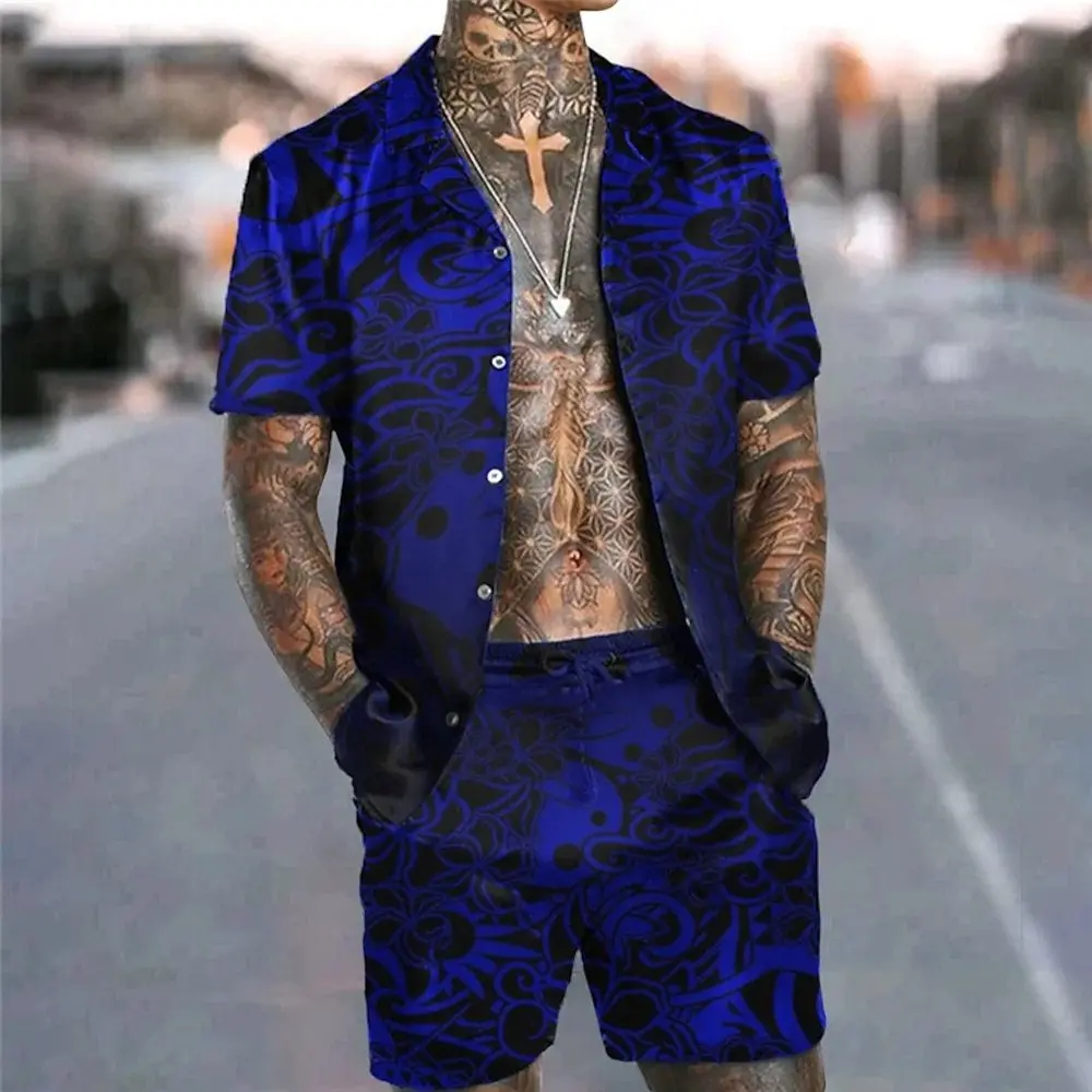 Burgundy Baroque Trim 2-Piece Mens Set: Short-Sleeve Shirt & Shorts for Streetwear & Vacations