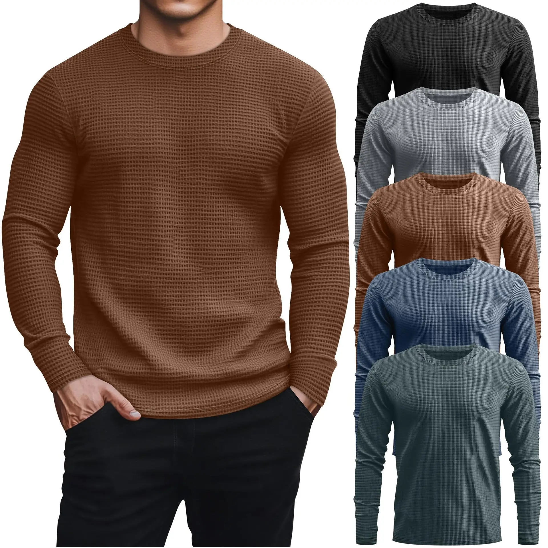 3 Pack Men's Waffle Long Sleeve Shirts, Crew Neck Thermal Underwear Tops Casual Pullover Sweaters Knit Undershirts