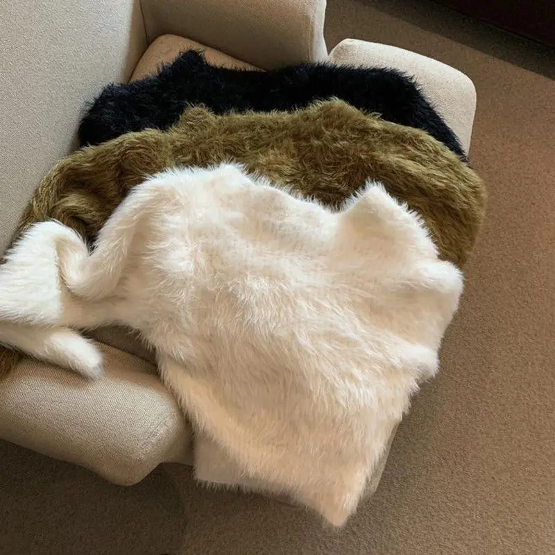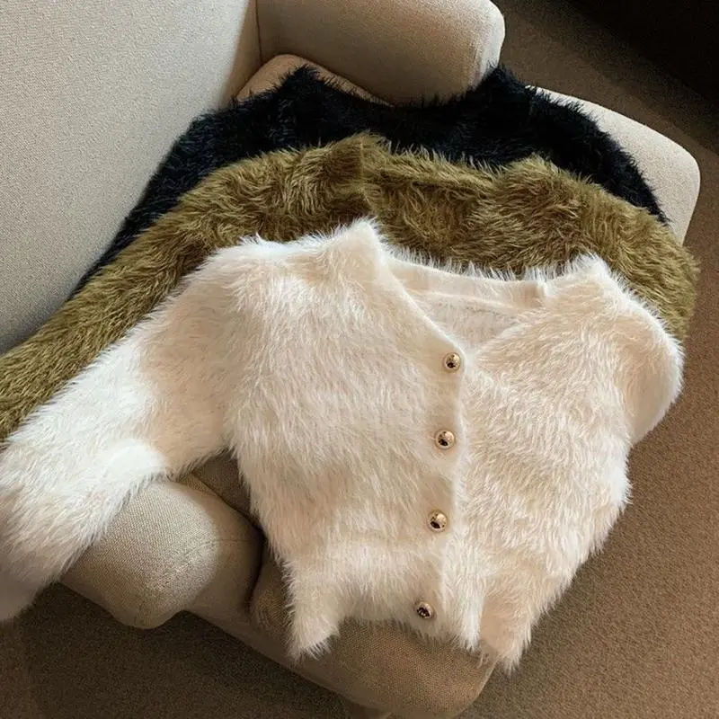 Vintage Cropped Mohair Knitted Cardigan Women V Neck Sweater Coat Streetwear Korean Black White Knitwear Solid Slim Jumpers New