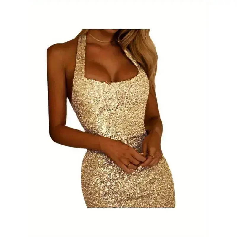 🌟 Elegant Golden Sequin Halter Dress 🌟 This sleeveless, backless party and evening gown is perfect for weddings and formal events. The dress features a high-low hem, adding a touch of elegance. Made from textured sequin fabric, it's a standout piece for any occasion. Machine washable, it's convenient for care. Ideal for party evening wear, this sequin gown is a must-have for any fashion-forward woman. 🎉 This elegant sequin gown is a versatile addition to any wardrobe. 🎀