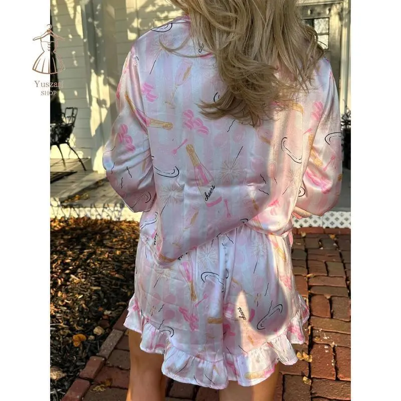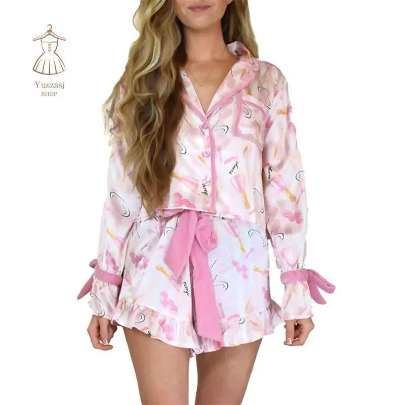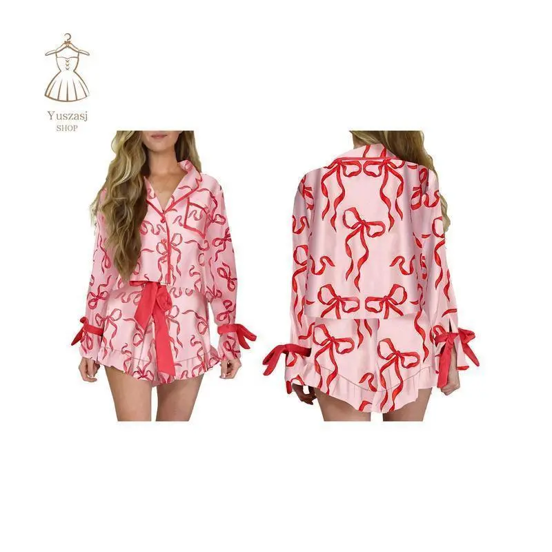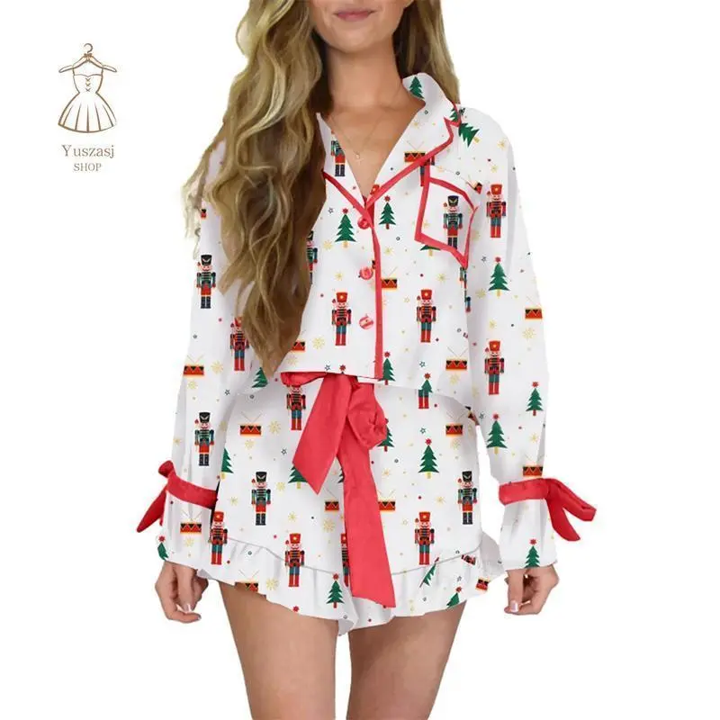 Women Christmas Pajamas Set 2 Pieces Loungewear Suits Bow/Cartoon/Plaid Print Long Sleeve Shirts Tops Shorts Sleepwear Outfits