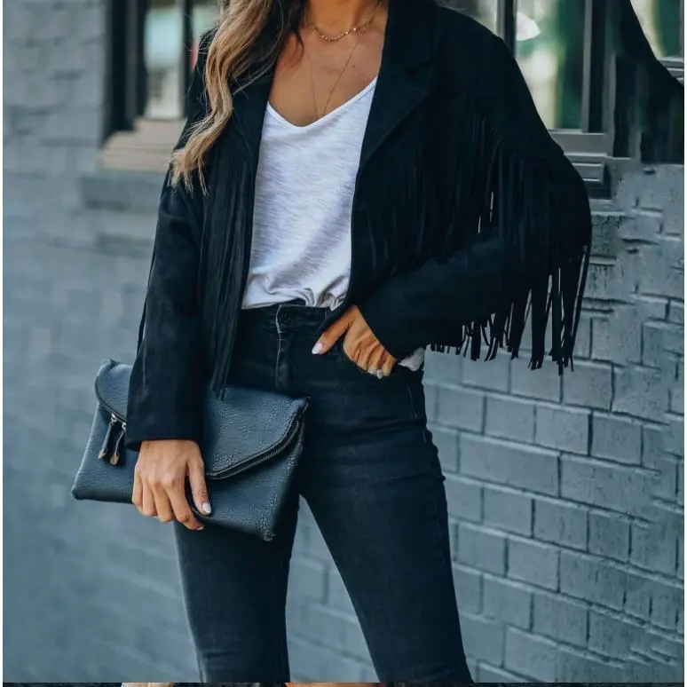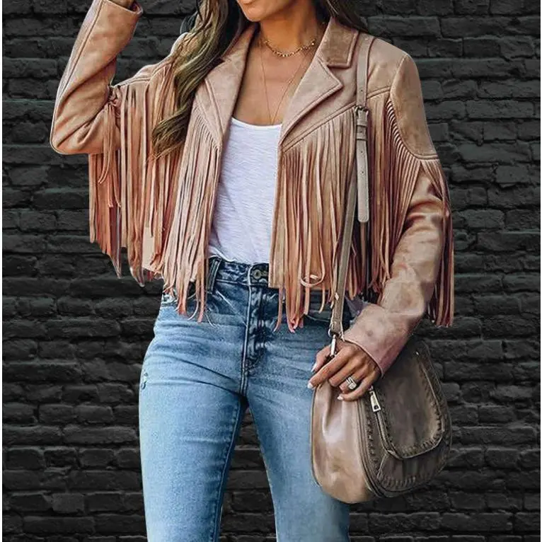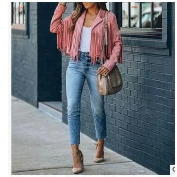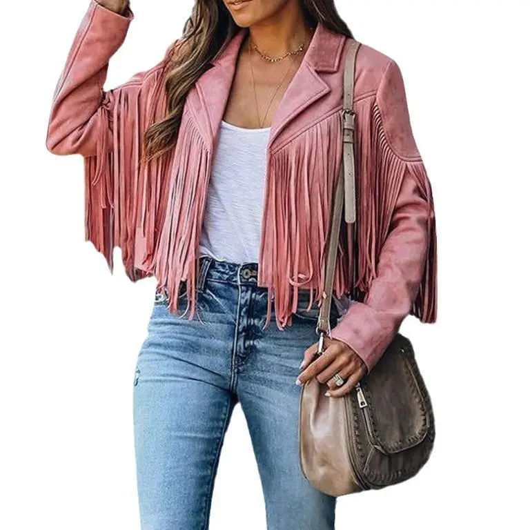A bold fusion of edge and playfulness, this solid color PU leather jacket elevates everyday style with its fringe trim detail and sleek fitted silhouette—perfect for spring and fall layering. The collared design adds a classic touch, while the long sleeves provide just enough coverage for transitional weather, making it a versatile staple for daily wear. ? Crafted from durable PU leather, the jacket offers a luxe look without the bulk, with a fitted cut that flatters curves while allowing room for layering over tees or lightweight sweaters. The fringe trim—dangling from hems, cuffs, or pockets—adds movement and bohemian flair, turning a basic leather jacket into a statement piece that catches the eye with every step. ? Ideal for spring breezes and fall chills, it pairs effortlessly with jeans and ankle boots for a casual errand run, or dresses up with a midi skirt and heels for a night out. The solid hue—whether classic black, rich brown, or bold red—acts as a versatile base, complementing any outfit from minimalist to maximalist. ? The collared neckline frames the face, while zipper or button closures ensure a secure fit against wind. Durable stitching keeps the fringe securely in place, even with frequent wear, and the PU leather resists scuffs to maintain its sleek appearance. A must-have for adding attitude to transitional wardrobes, this jacket proves that practical outerwear can be endlessly stylish—blending comfort, edge, and a touch of fringe fun.
