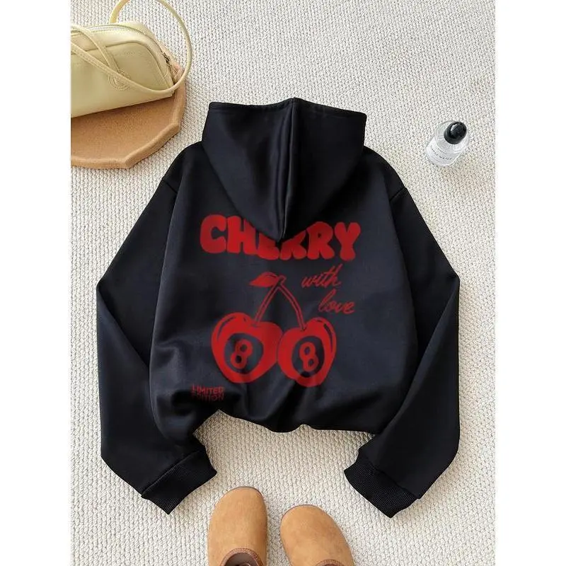 Women's Cherry & Letter Print Longsleeves Hoodie, Trendy Loose Fashion Casual Drawstring Pocket Hooded Cute Sweatshirts for Holiday Outdoor Wear, Limited Edition, Women Clothing, Going Out Tops, Graphic Hoodie, Loose Womenswear, Classic Fit Hoodie