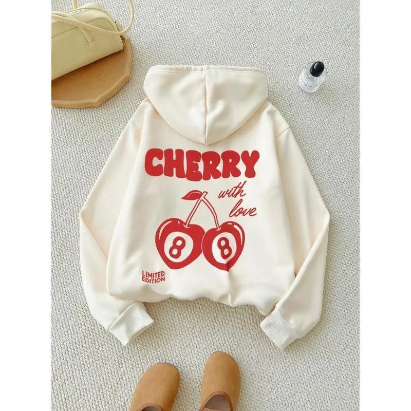 Women's Cherry & Letter Print Longsleeves Hoodie ✨ Elevate your style with this Women's Cherry & Letter Print Longsleeves Hoodie! 🌟 Trendy and loose, this fashion casual hoodie is perfect for holiday outdoor wear. It features a cute design with a drawstring pocket, making it a versatile addition to your wardrobe. Limited edition, this hoodie is ideal for going out tops. Available in pebble lime, black, and cream. This hoodie is a classic fit, making it a staple in your women'swear collection. Ideal for those looking for a trendy, casual hoodie.