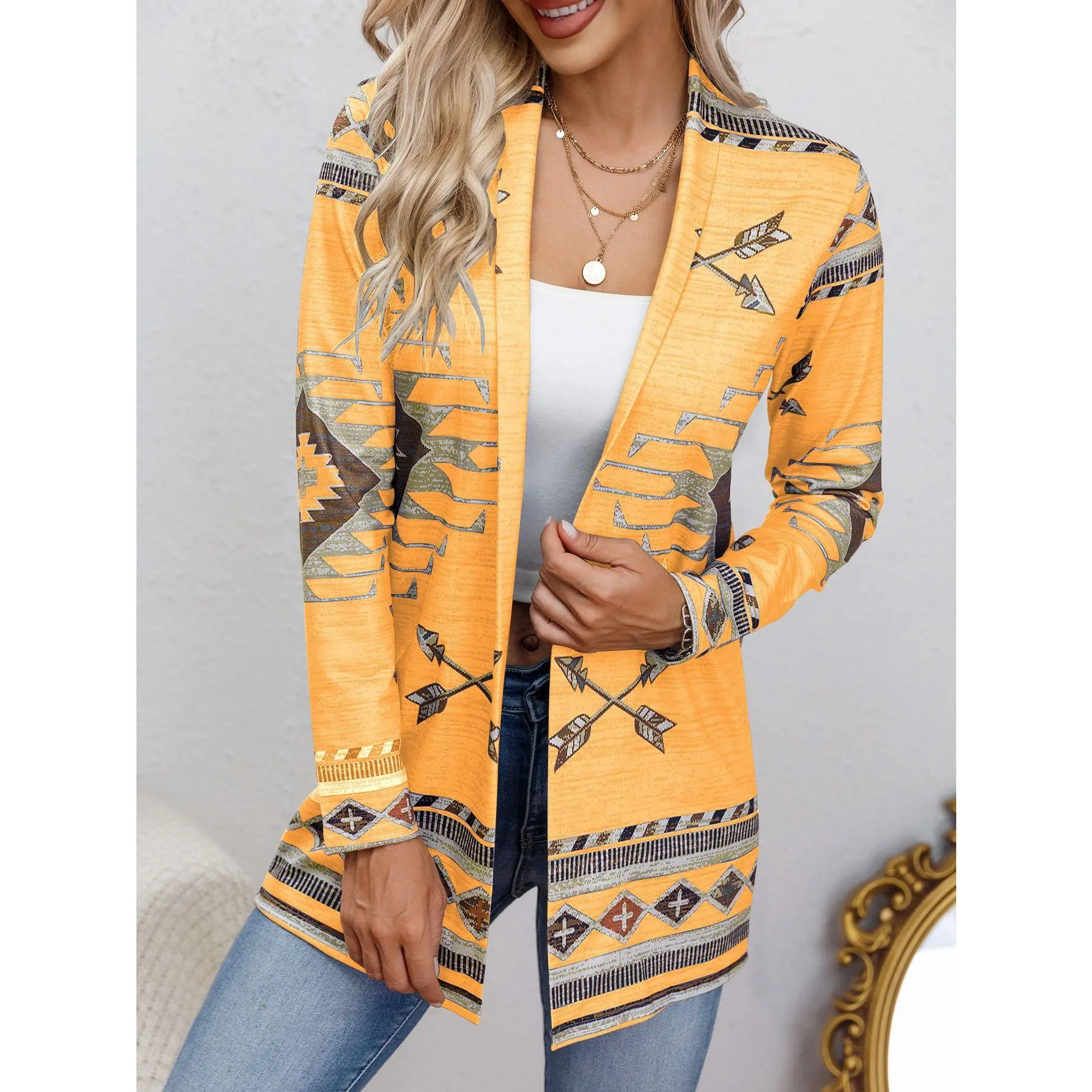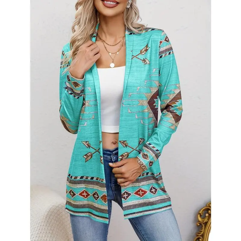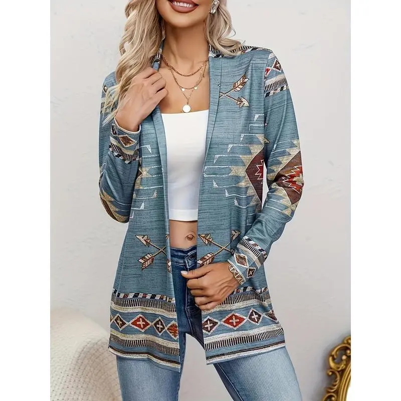 Western Ethnic Print Open Front Cardigan, Casual Long Sleeve Loose Cardigan, Women'S Clothing Womenswear Knitwear