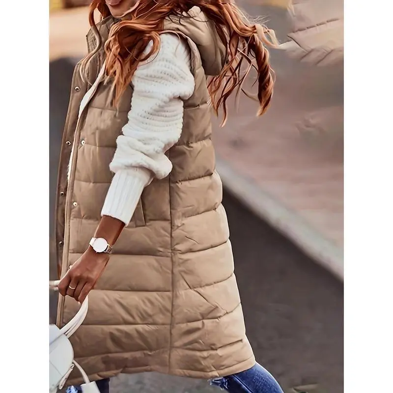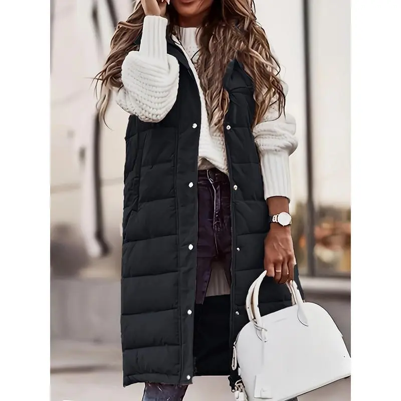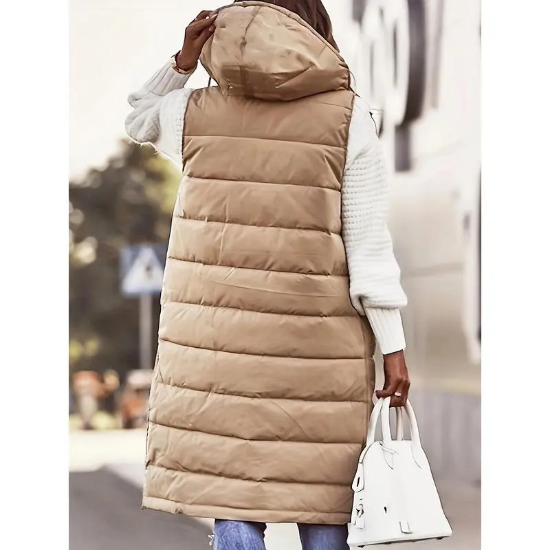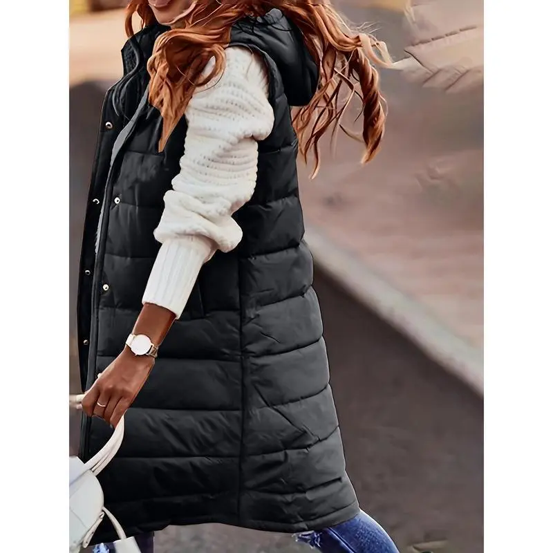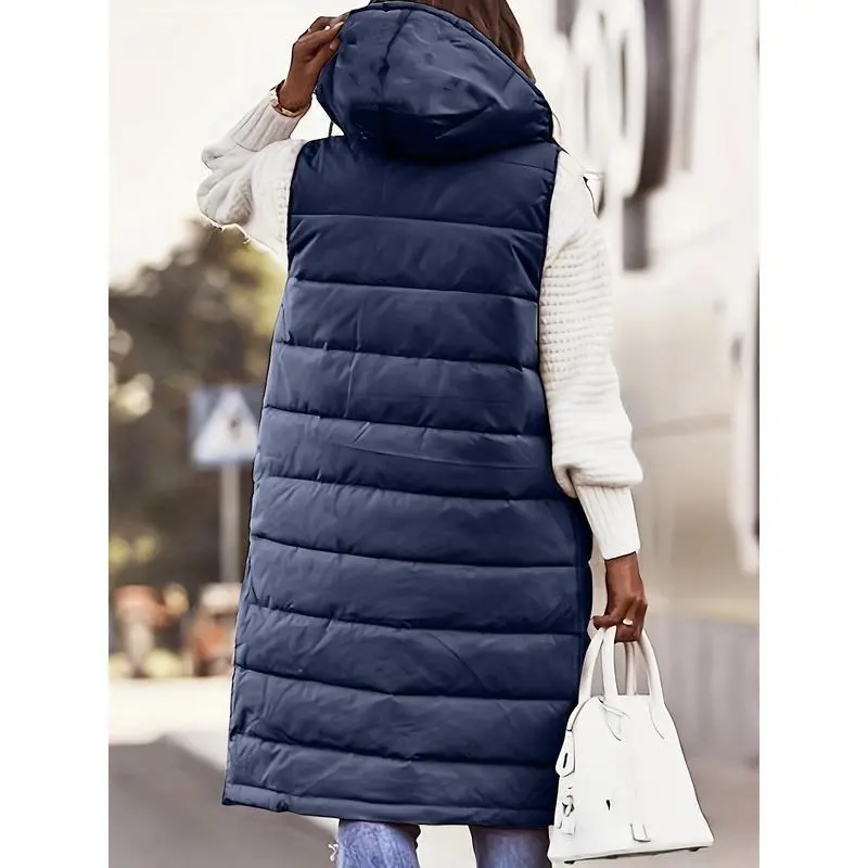Women'S Plus Size Winter Jacket, Casual Solid Color Hooded Long Puffer Vest, 100% Polyester, Knee Length, Woven Weave