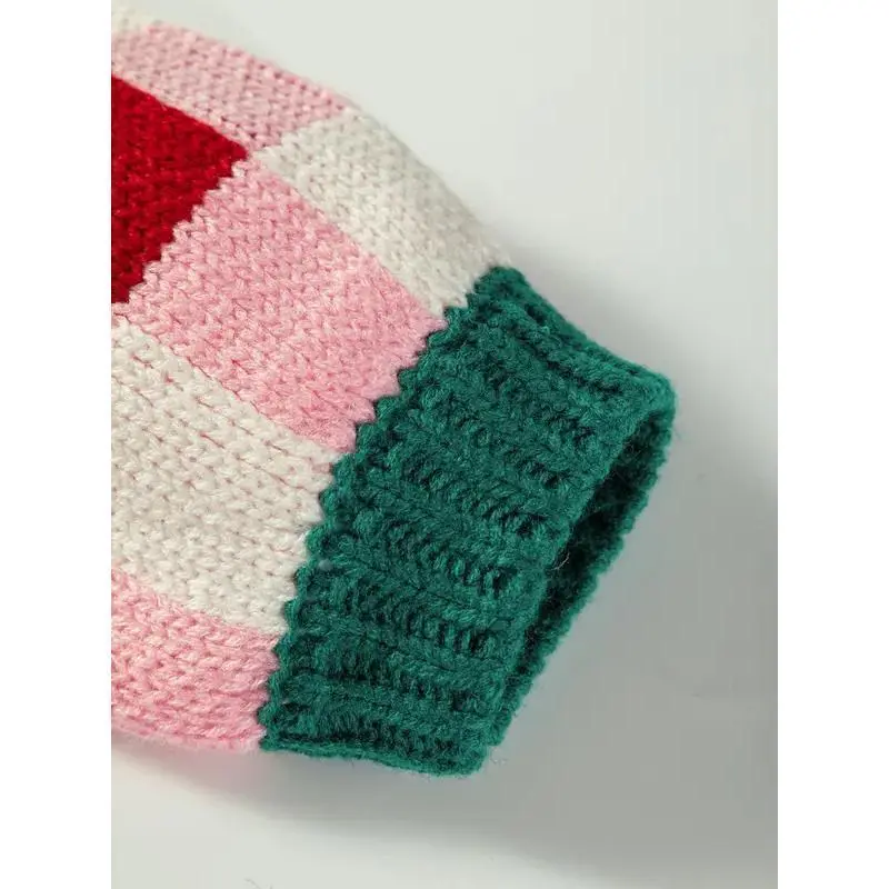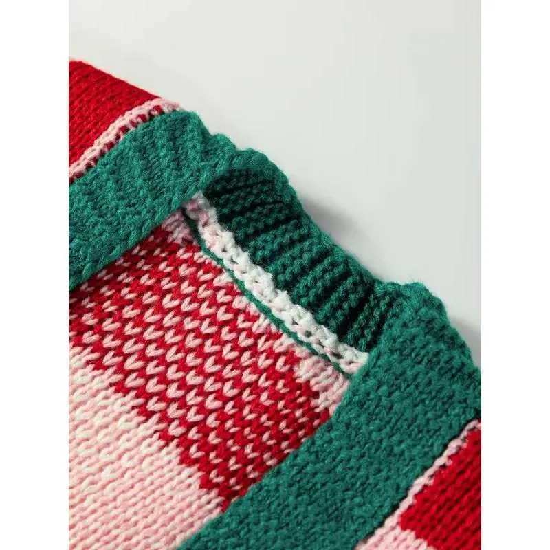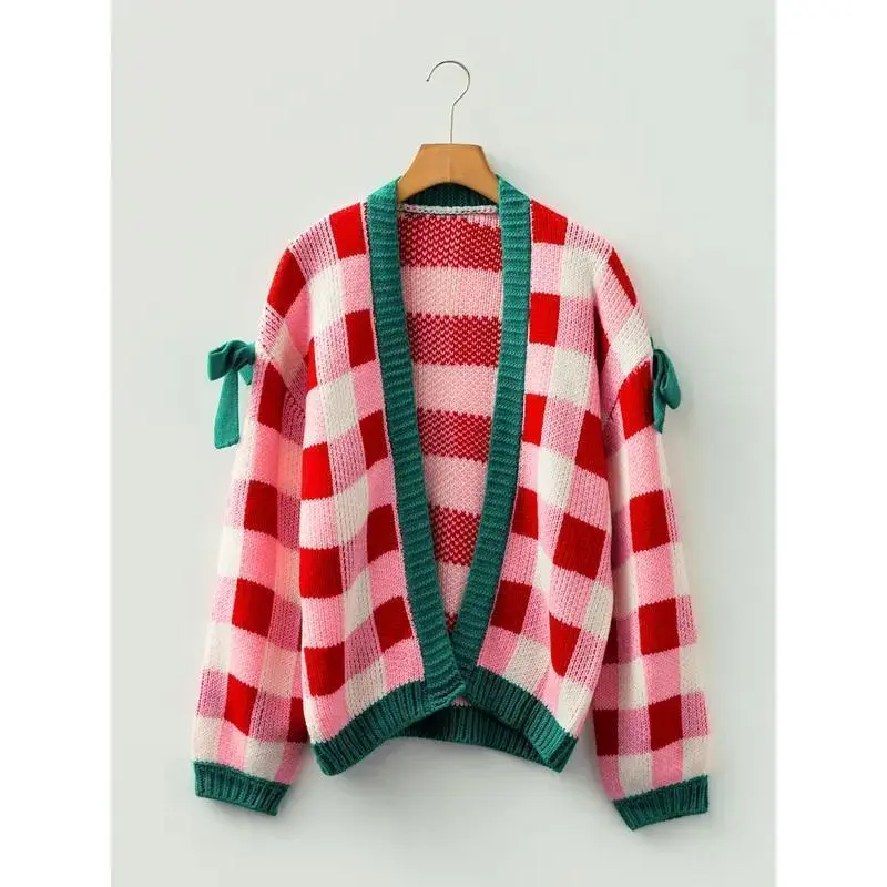 Christmas Winter Knitted Plaid Color Block Bow Tie Collarless Long Sleeve Cardigan, Casual Daily Wear, Women's Fashion Sweater