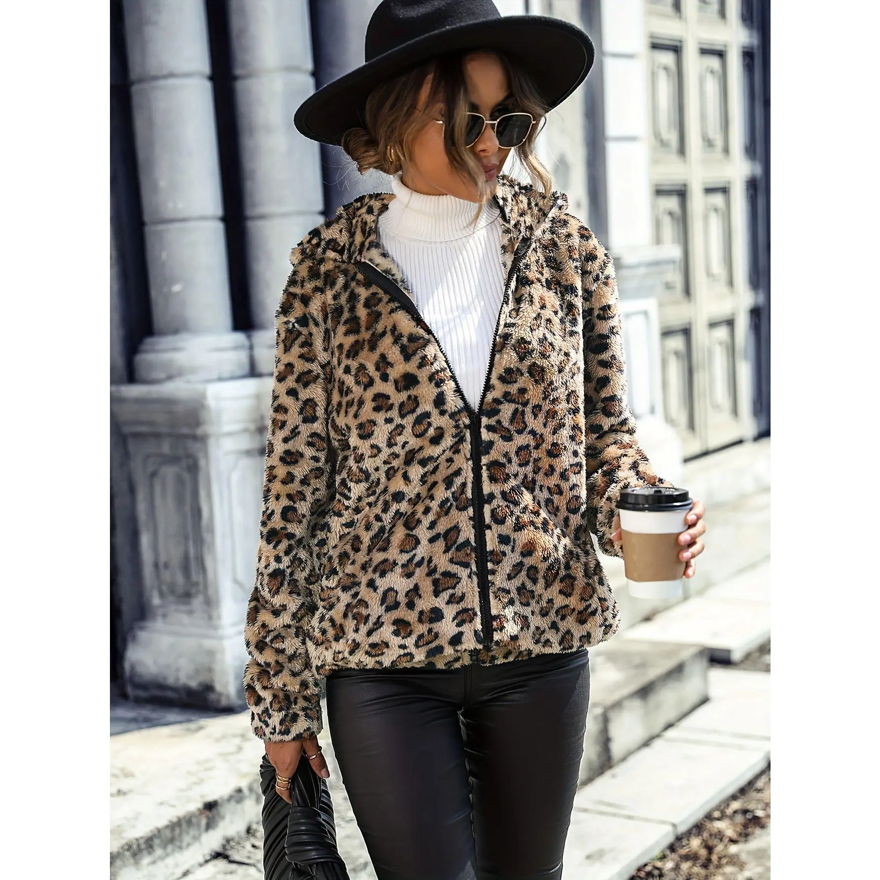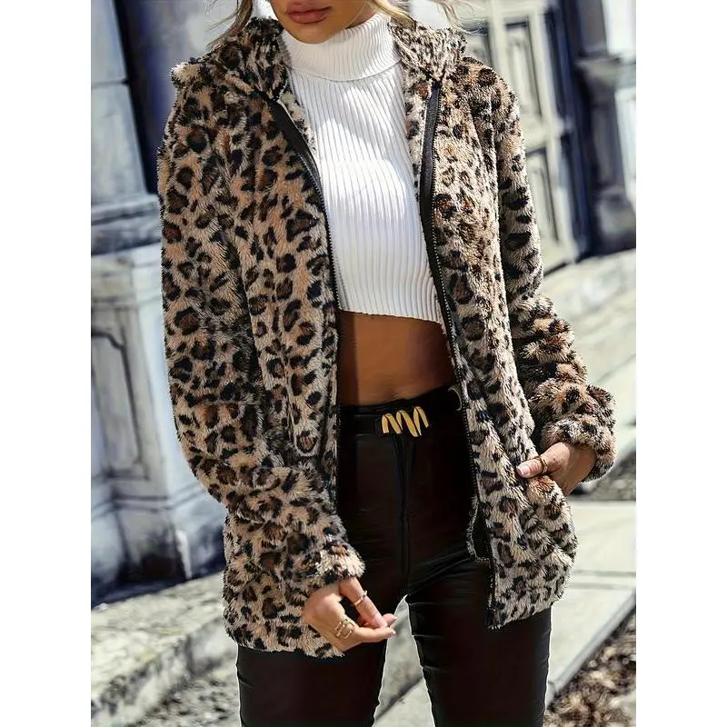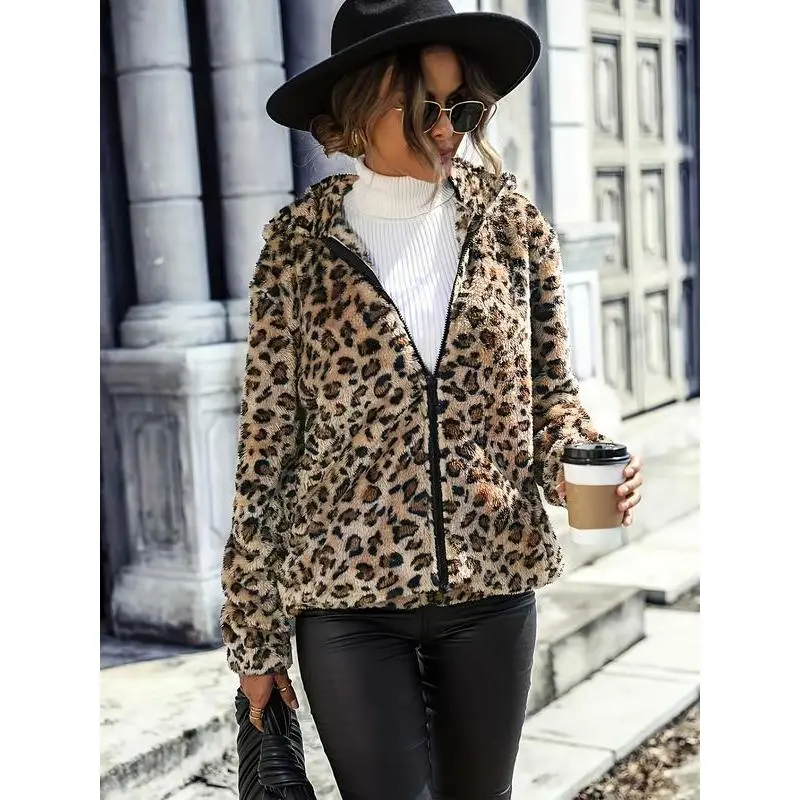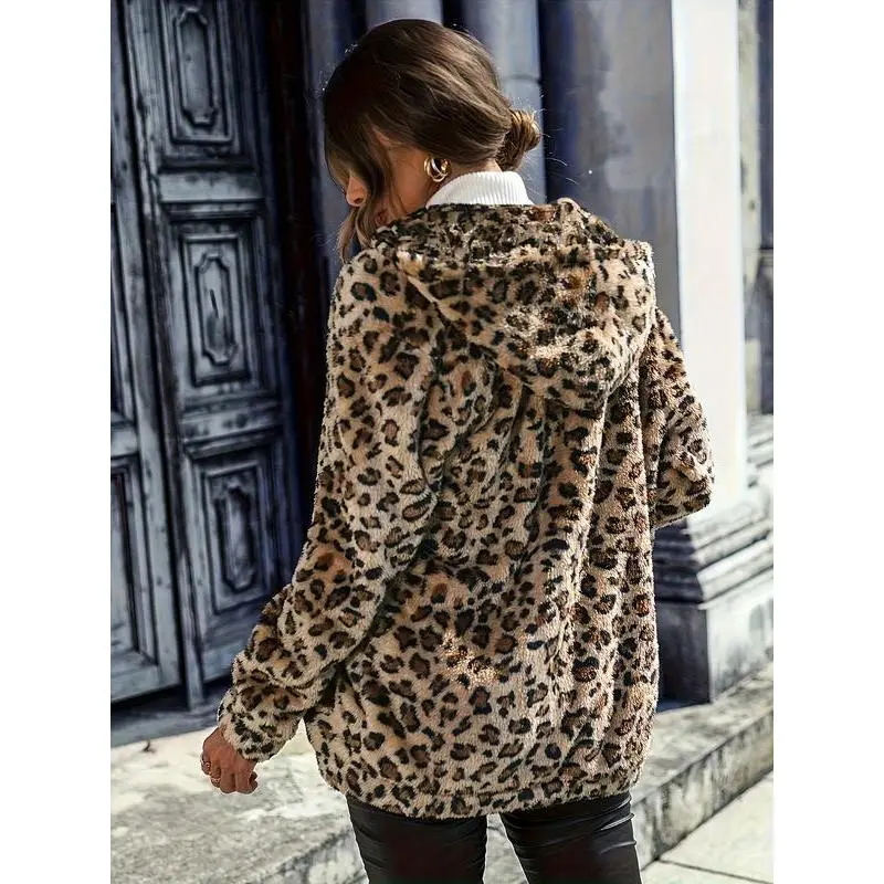 Women's Winter Hooded Leopard Print Jacket, Loose Fit Long Sleeve Outerwear, Casual Two-Sided Velvet Coat, Plus Size Available