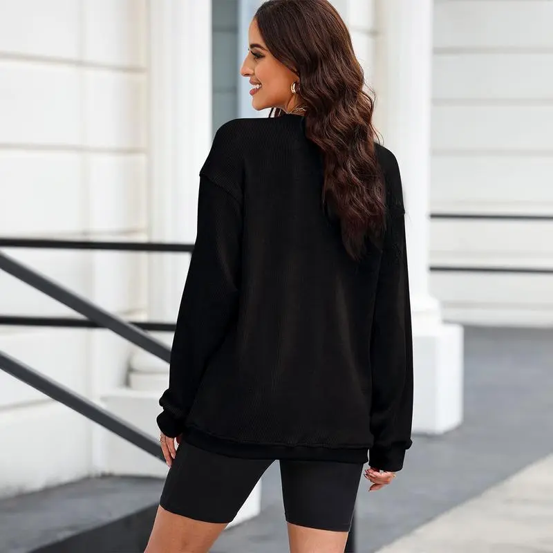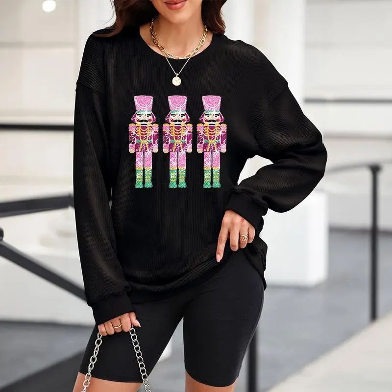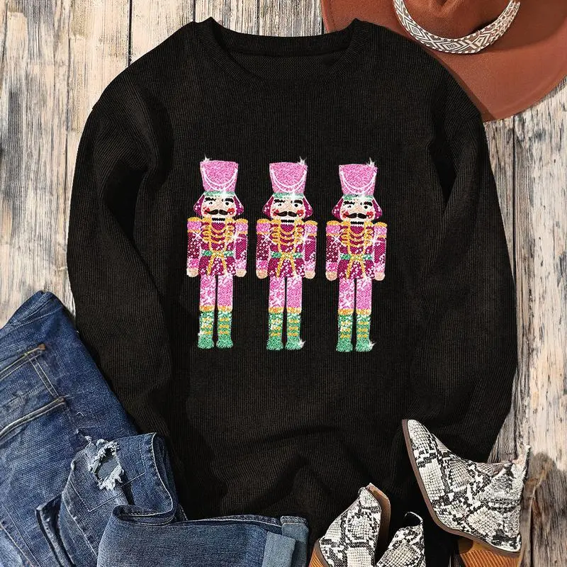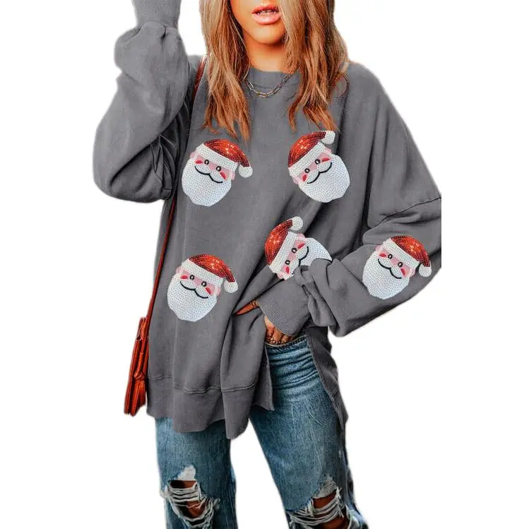 Mntaor Women's Christmas Santa Face Black Long Sleeve Graphic Pullover with Red Sequin Applique, Cute Casual Holiday Sweatshirt for Xmas Party, Festive Cozy Outfit,Winteroutfit
