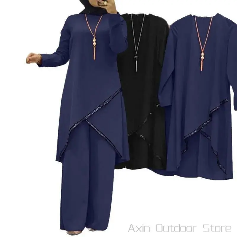 Women Eid Musulman Ensemble Muslim Sets Solid Blouses Wide Leg Pants Ramadan Morocco Two Pieces Dubai Kaftan Loose Modest