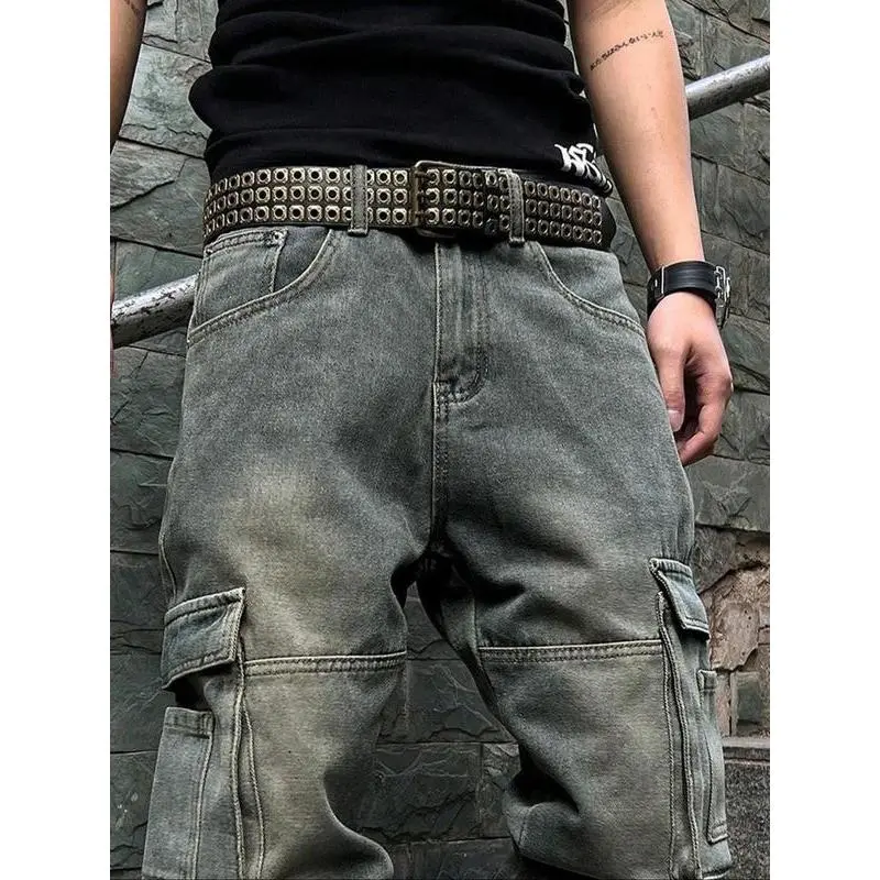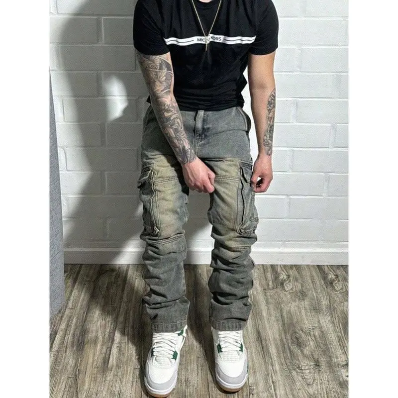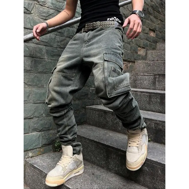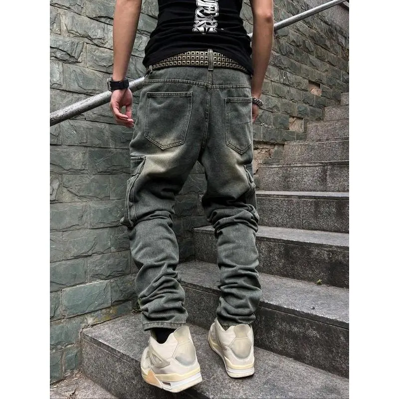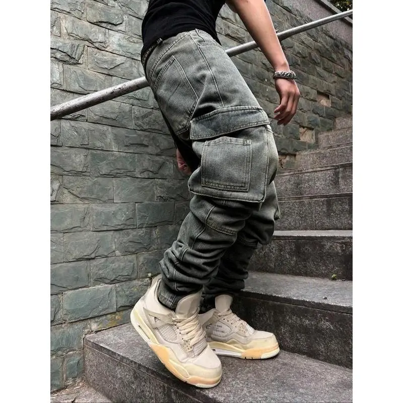 Men's Pioneer Trend Heavyweight Washed Vintage Street Casual Workwear Jeans Extra-Long Straight Loose Fit | Multi-Pocket Design for All Seasons | Button Closure Ideal for Men's Daily Wear