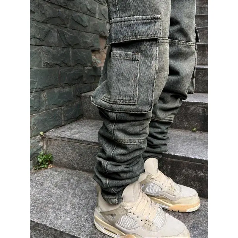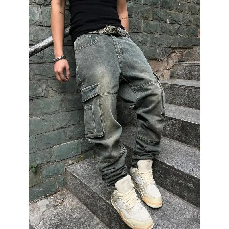 Men's Pioneer Trend Heavyweight Washed Vintage Street Casual Workwear Jeans Extra-Long Straight Loose Fit | Multi-Pocket Design for All Seasons | Button Closure Ideal for Men's Daily Wear Key features: