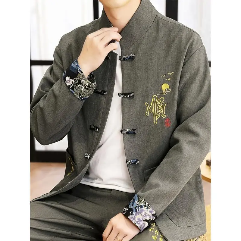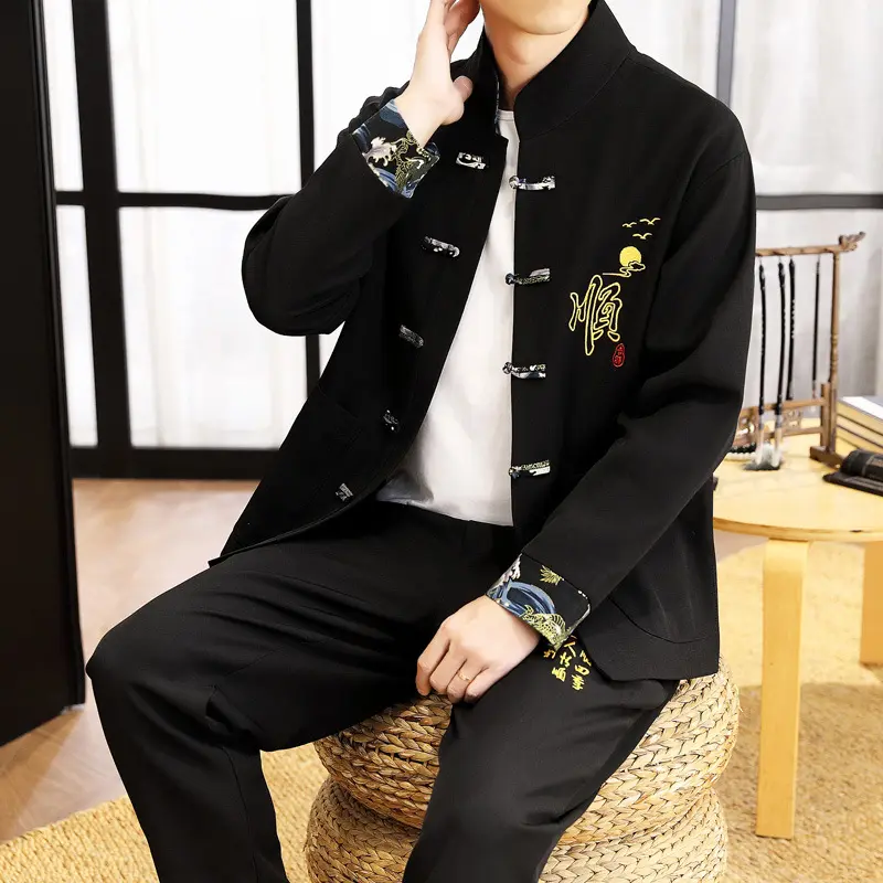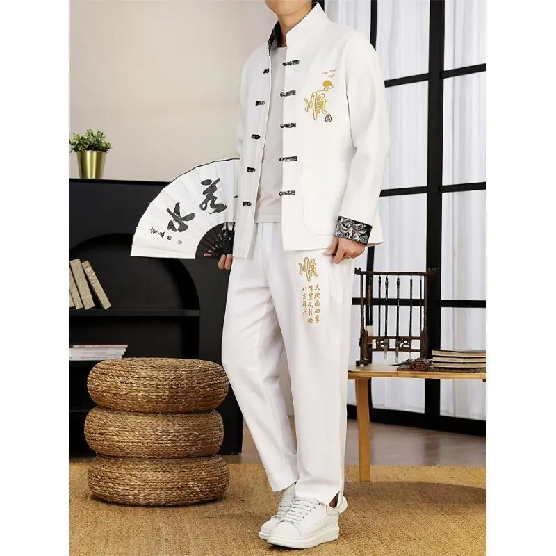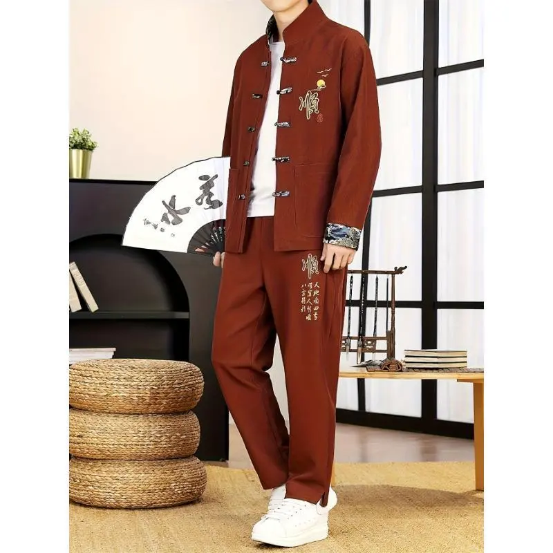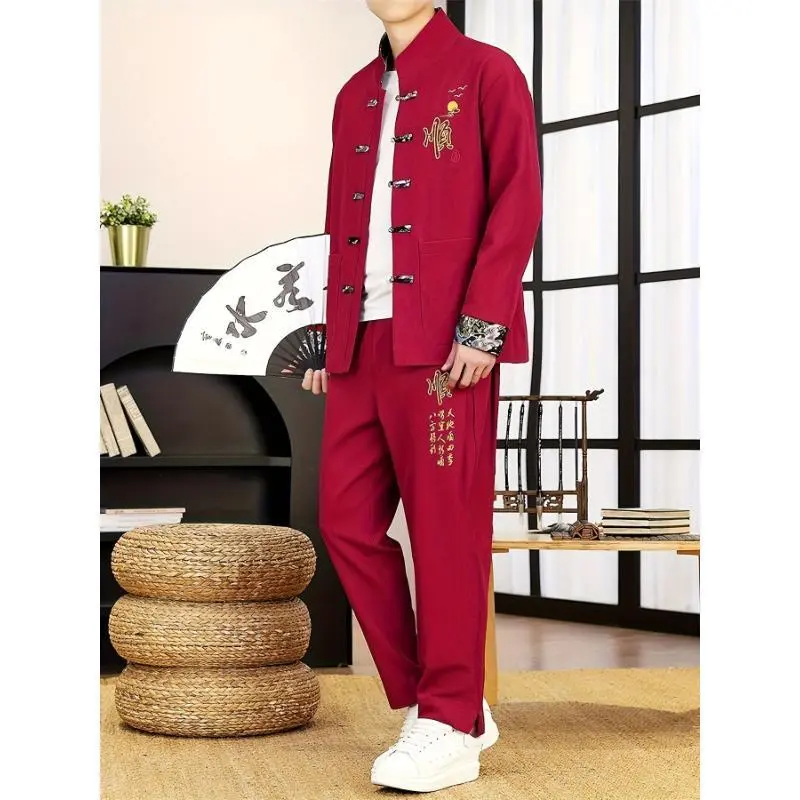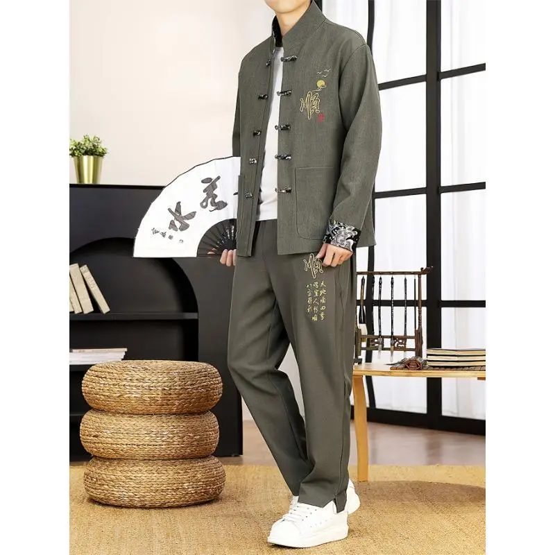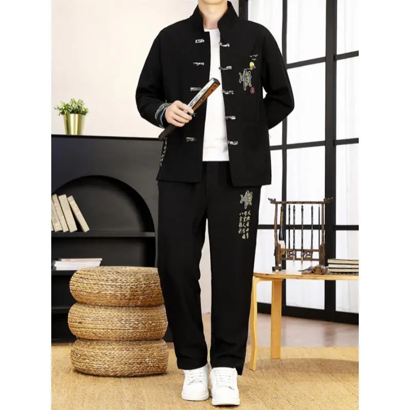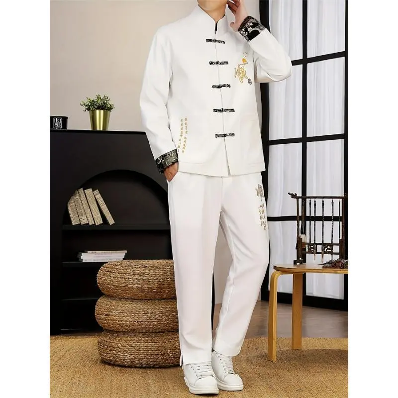 Men's Two-Piece Kung Fu Suit Tang Suit Set with Chinese Style Disc Buckle Stand-up Collar Jacket and Spring/Autumn Printed Trousers