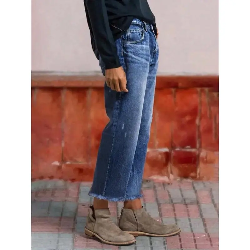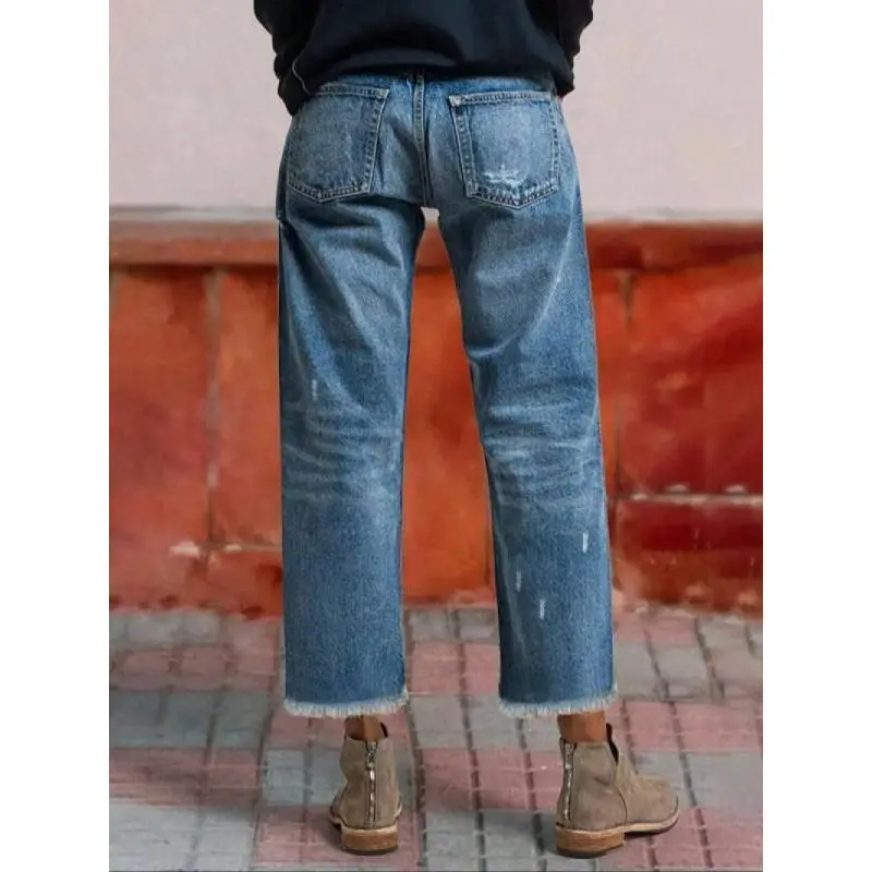 [Relaxed fit]: The loose-fitting cut allows for freedom of movement during everyday activities and outings. [Distressed details]: Featuring a washed and frayed edge look, these jeans offer a contemporary casual vibe that stands out. [Seasonal versatility]: Designed for all seasons, these denim shorts are adaptable for any weather, ensuring wearability year-round. [Moderate fabric thickness]: Crafted from medium-weight denim, these pants provide durability without sacrificing breathability for year-round use. [Straight leg cut]: The straight leg design delivers a classic silhouette, making them suitable for various occasions and outfits.