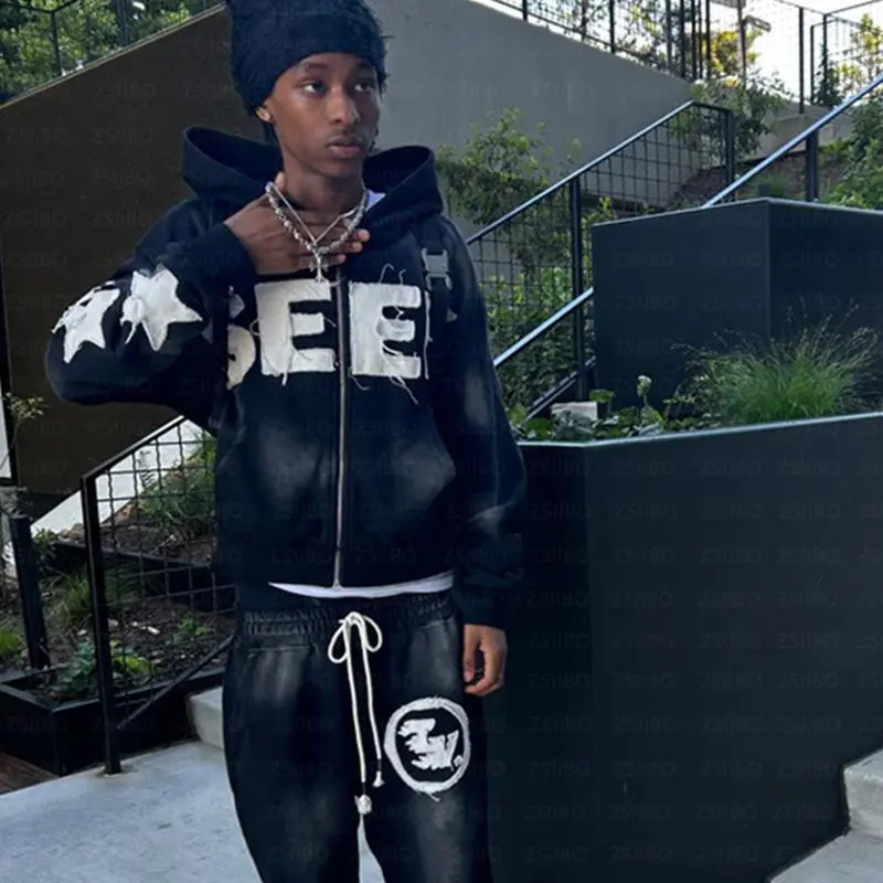 Autumn Winter Vintage High Street Y2K Letter Sticker Embroidery Casual Loose Hoodie Coat Straight Leg Pants Men Women Clothing