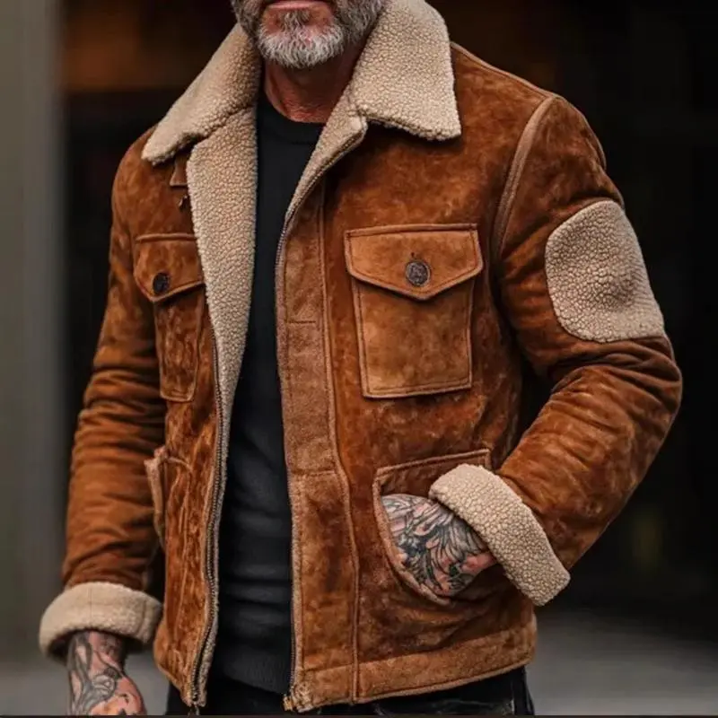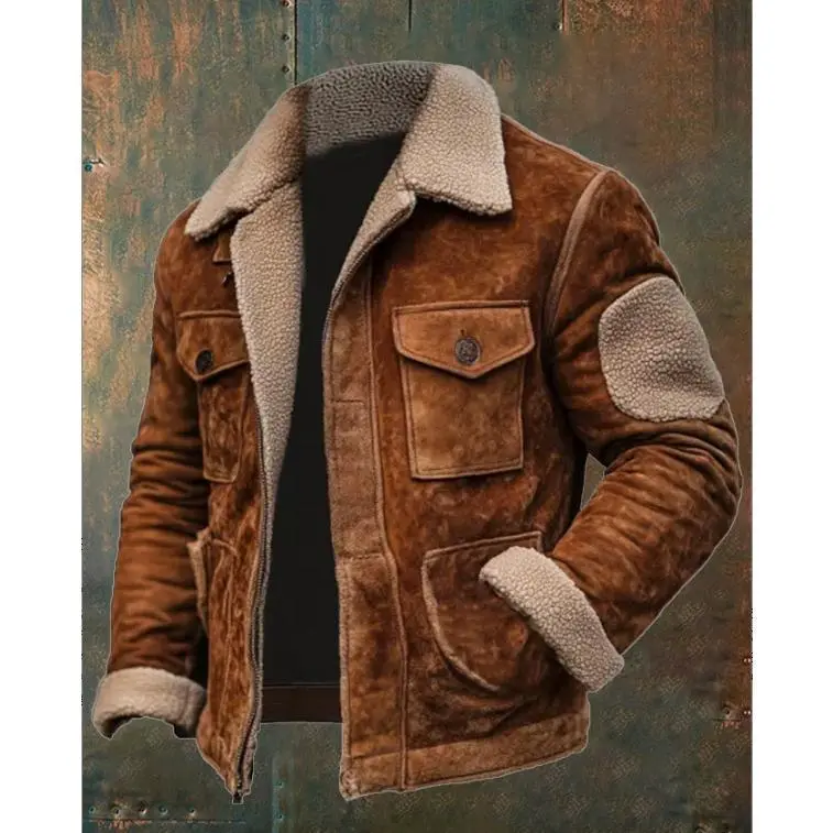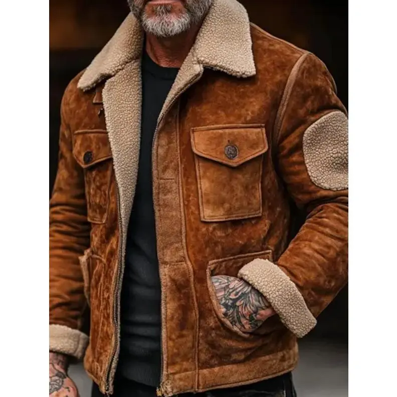 Men's Shearling Lined Suede Leather Jacket with Sherpa Collar and Elbow Patches, Warm Winter Outerwear