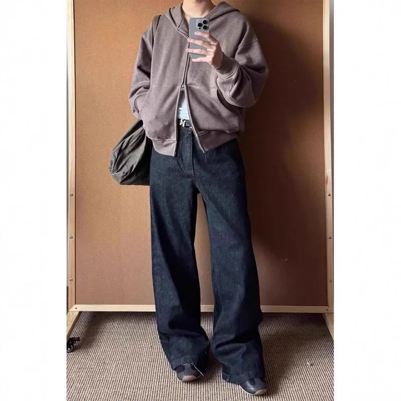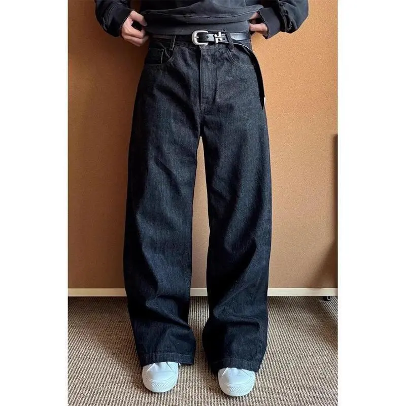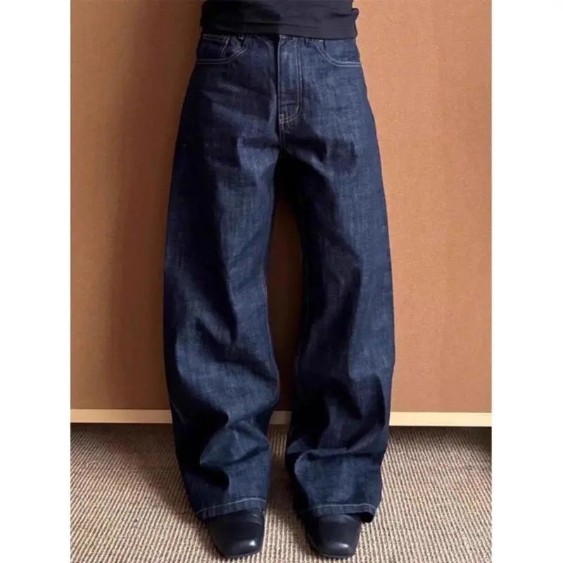 New Denim Blue A-Line Wide-Leg Jeans for Men, Autumn and Winter American Retro Pants, Raw Denim Straight-Leg Flared Pants