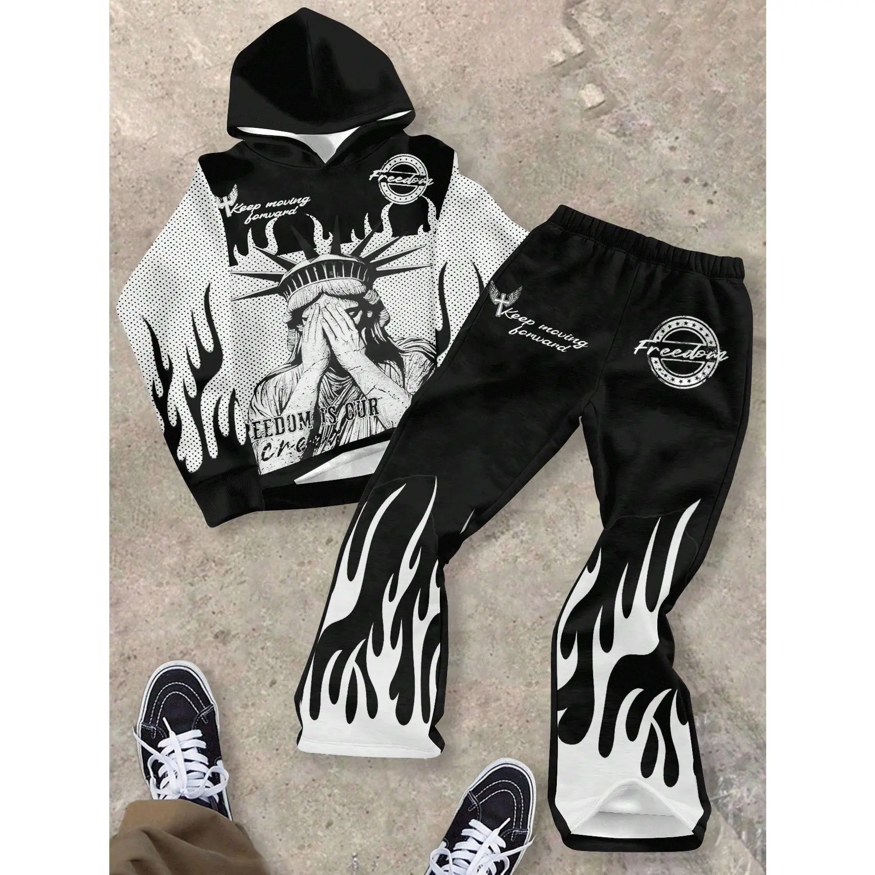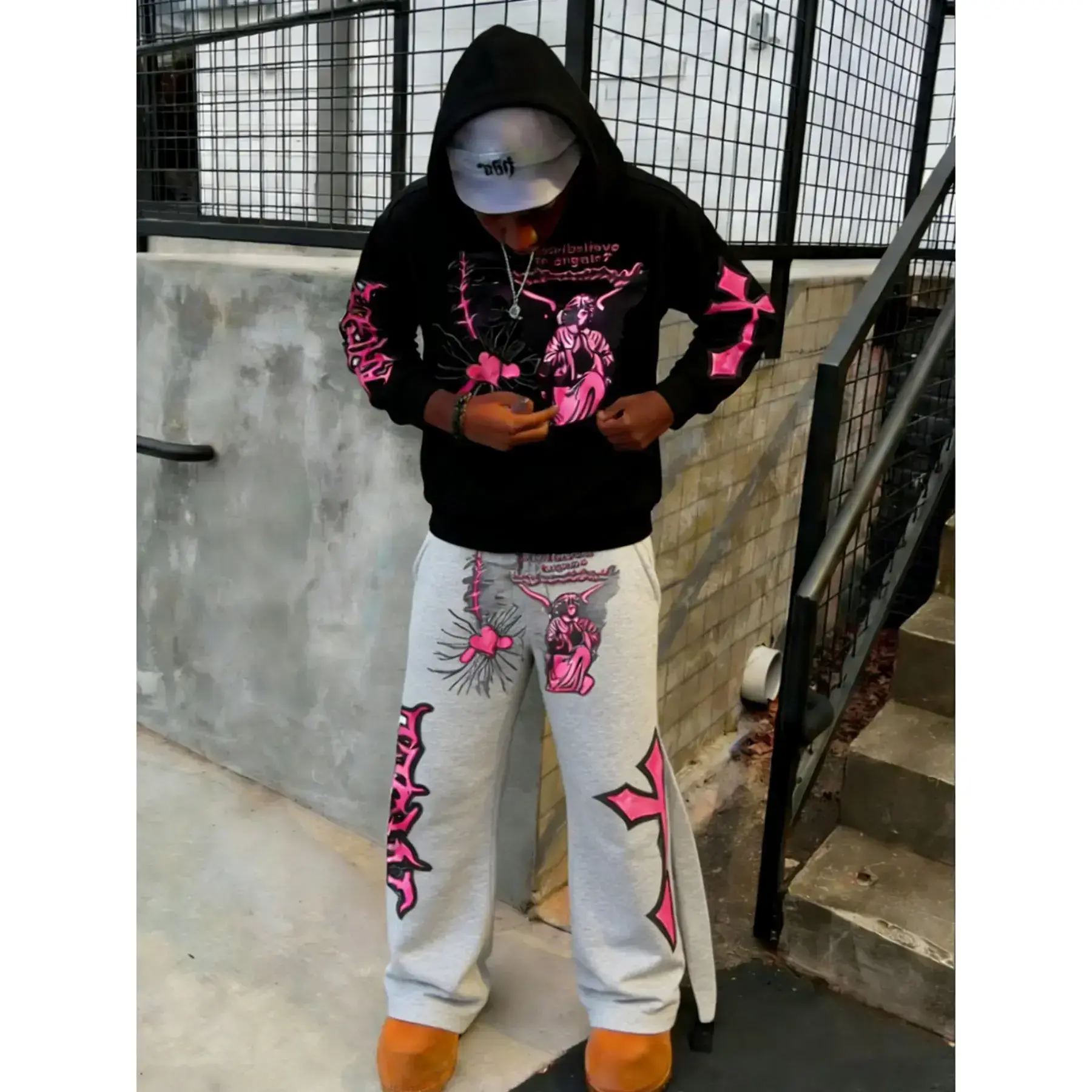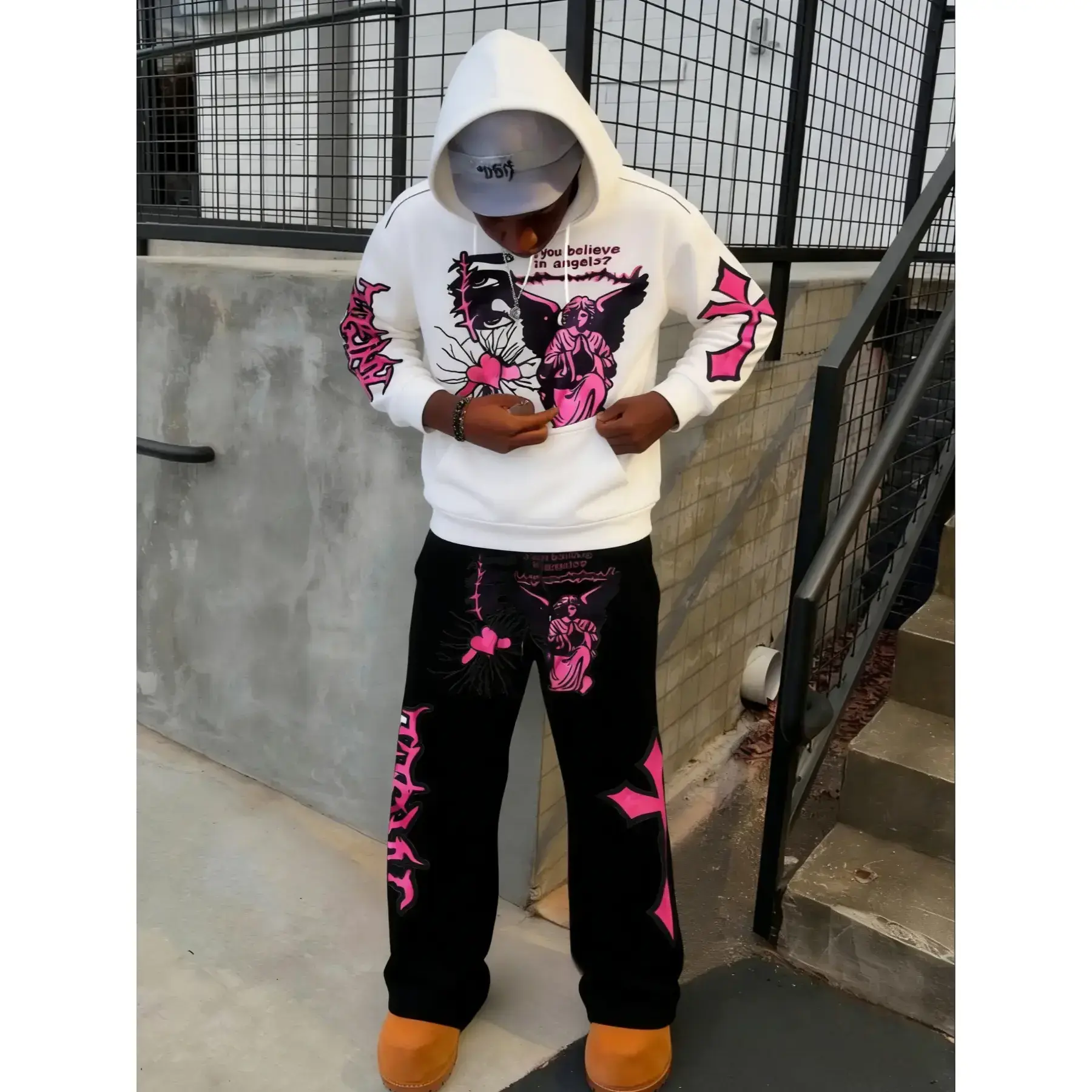 【Unique Print】: Features eye-catching neon pink angel, heart, and thorn prints for a standout appearance. 【Soft Fabric】: Crafted from soft, breathable cotton material that enhances everyday wear and user experience. 【Loose Fit】: Includes a relaxed, oversized hooded sweatshirt for unrestricted movement during activities. 【Long Pants】: Accompanied by long, regular-length pants designed for warmth and coverage during fall and winter. 【Catchy Text】: Sports the phrase 'Do you believe in angels?' adding an intriguing element to your outfit.