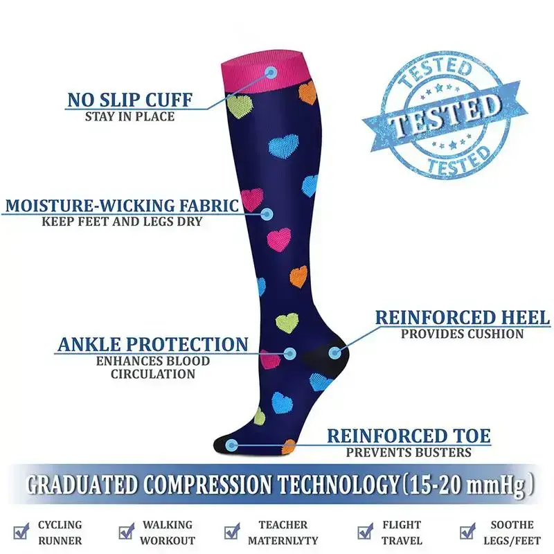 Experience all-day comfort and superior performance with our compression socks, designed to provide graduated compression for better support, stability, and recovery. Whether you're an athlete, runner, or someone who spends long hours on their feet, these socks help reduce muscle fatigue, enhance circulation, and improve endurance. Premium Material – Made from 85% Nylon and 15% Spandex, these socks offer a breathable, moisture-wicking, and flexible fit to keep your feet dry and comfortable all day. Performance-Driven Design – Designed for running, cycling, hiking, and fitness training, these compression socks deliver targeted support to the calf and ankle, reducing swelling and soreness. Versatile & Stylish – Whether you're hitting the gym, working long shifts, or traveling, these compression stockings are perfect for athletes, fitness enthusiasts, office workers, and travelers. 6 Pairs for Everyday Use – Enjoy a great value pack, ensuring you always have a fresh pair ready for work, workouts, and recovery. Step into ultimate comfort and support with these high-performance compression socks—your perfect companion for an active and healthy lifestyle!
