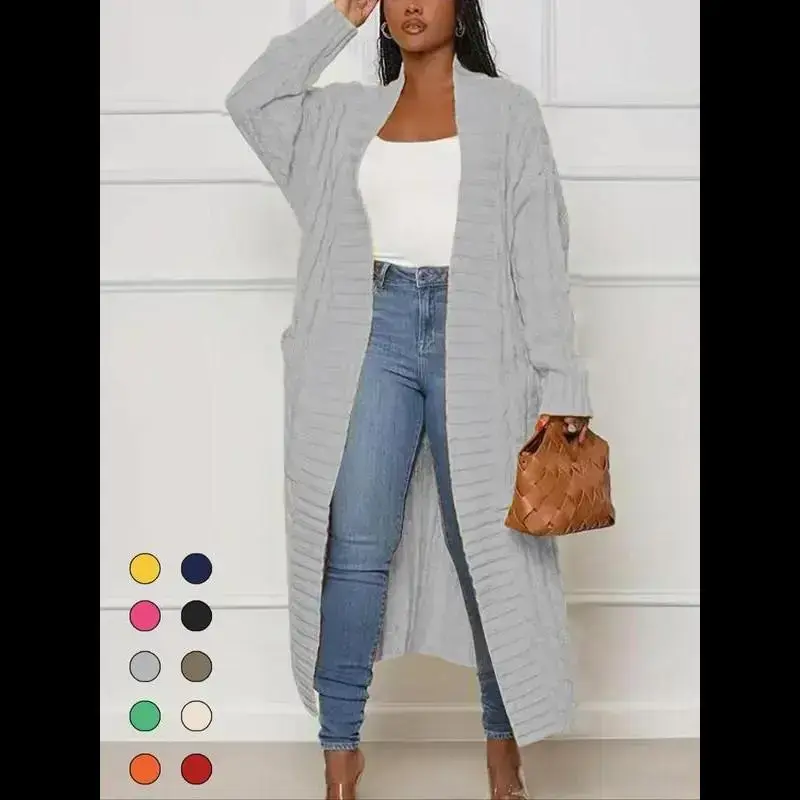 Women's Solid Color Textured Drop Shoulder Pocket Longline Cardigan, Casual Open Front Long Sleeve Knitwear for Fall & Winter, Women's Knit Clothing for Daily Wear, Lady Baggy Cardigans for Women, Womenswear, Comfy Fabric