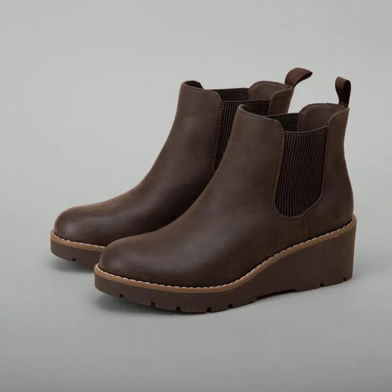 Style:Fashionable Closure Type:Slip on Festivals:Thanksgiving Day Pattern Type:Plain Details:Side zipper Occasion:Office Heels:Wedges Color:Brown Type:Chelsea Boots Toe:Point Toe Heel Height:Mid Heel Boots Height Type:Ankle Boots Upper Material:PU Leather Outsole Material:Rubber