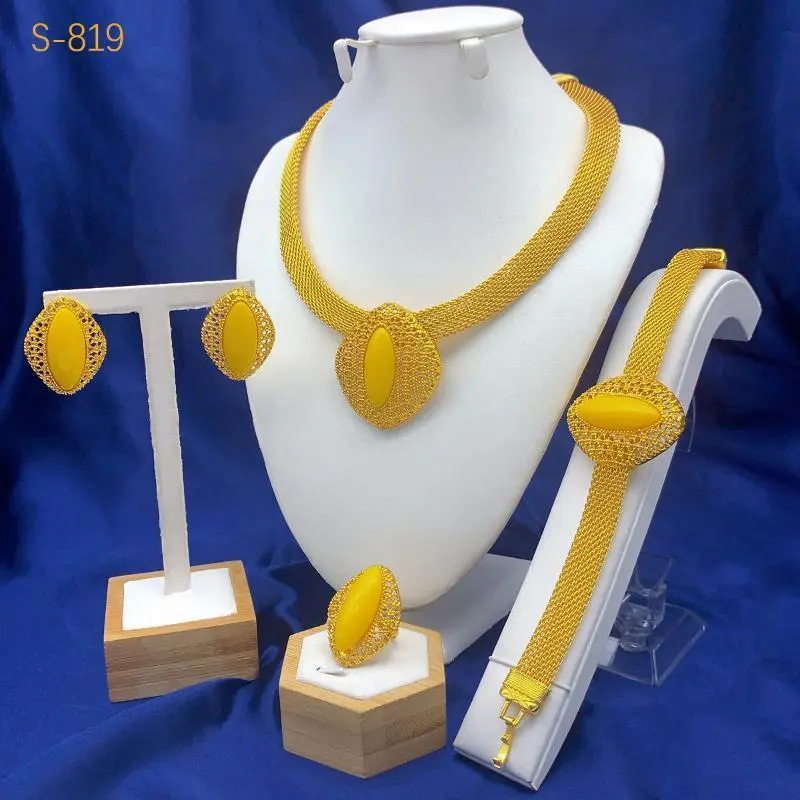 24k Gold Plated Jewelry Set Middle East Dubai Bridal Necklace Earrings Hands Cuban Mesh Link Style
