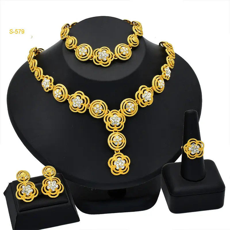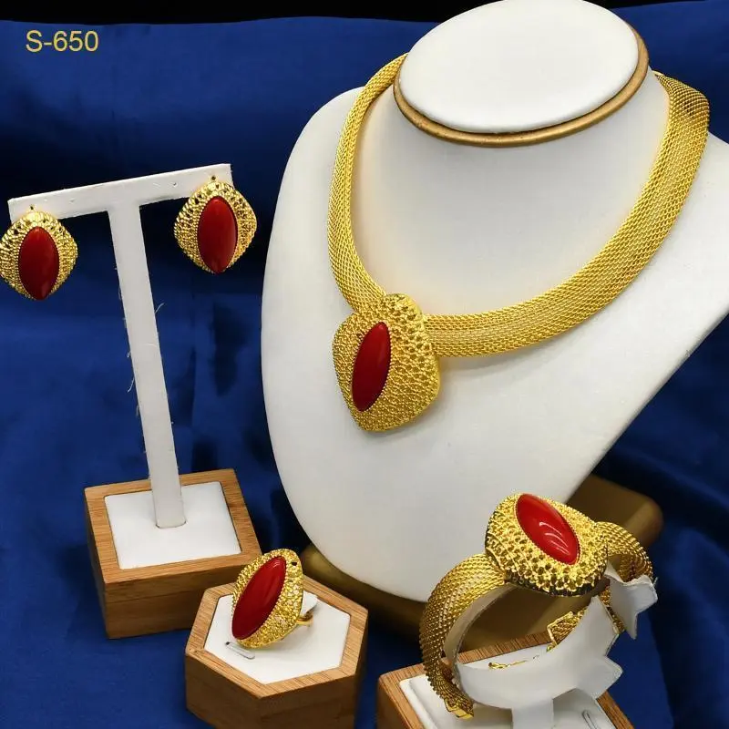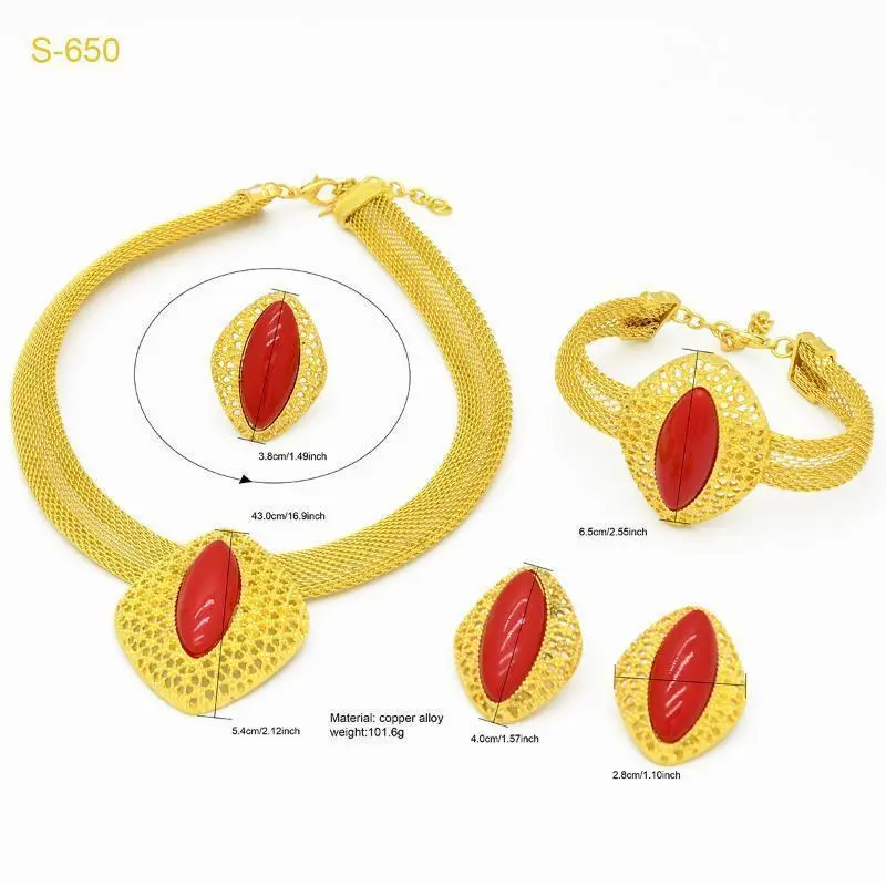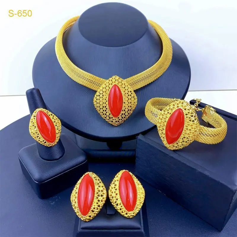 Material: Alloy/Processing technology: electroplating/Women's suit combination: earrings + necklaces + hand decorations/Chain style: Mesh chain/Pendant material: Alloy/Color: Gold/Style: Ethnic style/Popular elements: auspicious pattern Dubai bride 24k gold-plated necklace bracelet earring ring jewelry set/Applicable to people: women style/Popular elements classification: Ethnic/national style