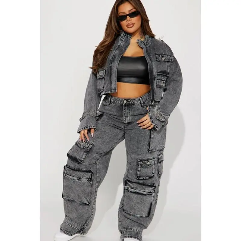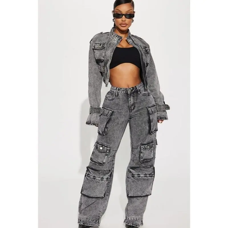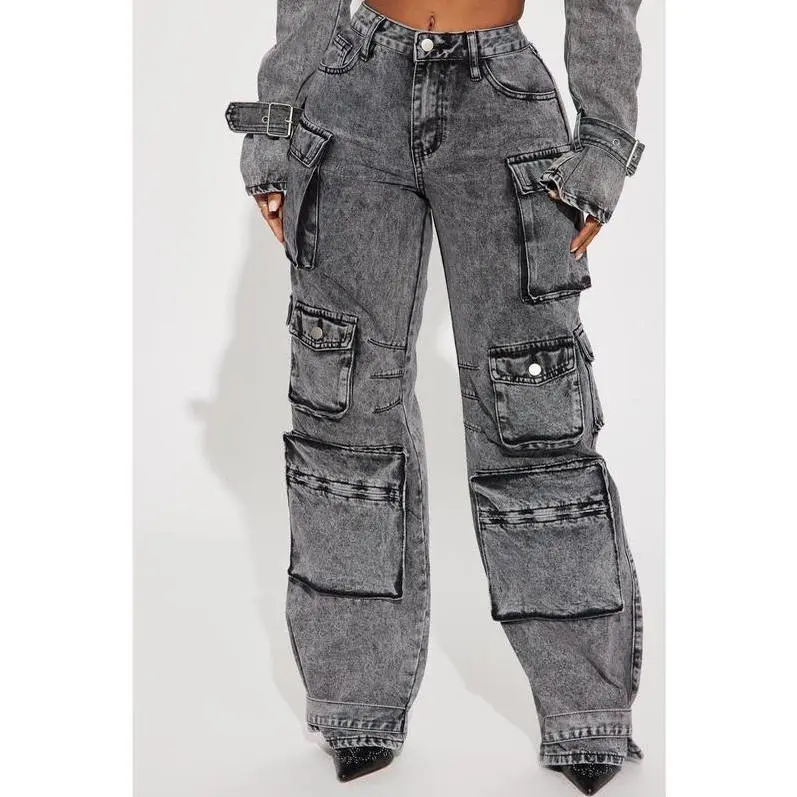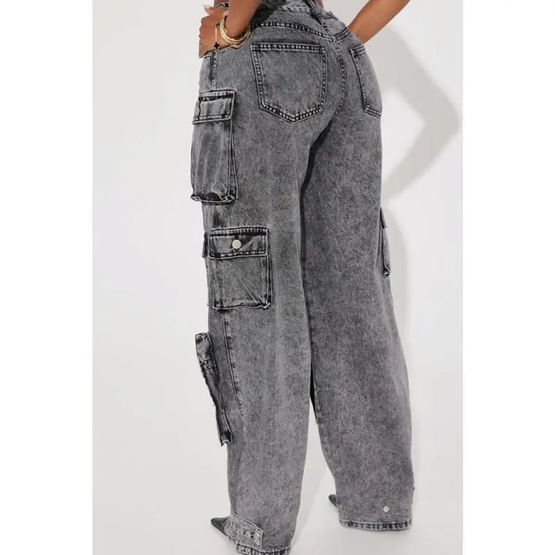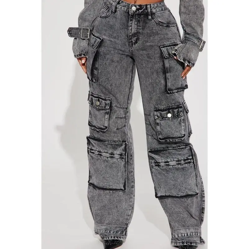 Billie Low Slung Cargo Jeans Acid Wash Black 9 Cotton Denim Loose Fit with Cargo Pockets Functional Snap Tab at Ankle Women's Garment