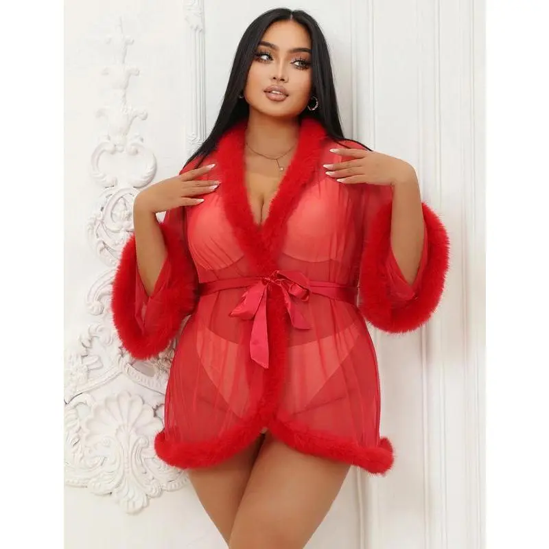 Fabric: This women's long-sleeve nightgown is made of high-quality transparent mesh fabric and faux fur Fashionable Sexy Nightgown: Transparent Nightgown, Short Sleeve Design, Slanted V-neck, Ribbon Decoration, Sleeves or Hem Trimmed with Faux Fur, Perfectly Shows Your Figure, Makes You Look More Elegant Suitable for Occasions: Perfect as a bridesmaid dress or bridal chamber dress! Ideal for Valentine's Day gifts, bridal lingerie gifts, bachelorette parties, lingerie parties, birthday parties, costume parties, maternity photoshoots, bridal chamber photoshoots, comedy performances, or late-night dates with your special partner Great Gift: The transparent mesh bathrobe can be used as a perfect gift for brides, best friends, lovers, wives, newlyweds, or as a treat for yourself on weddings, birthdays, honeymoons, Valentine's Day, Christmas, Halloween, anniversaries, and other holidays Style: Transparent Robe with Fur, Mesh Short Sleeve Bridal Kimono Robe Nightgown, Feather Bridal Robe for Wedding