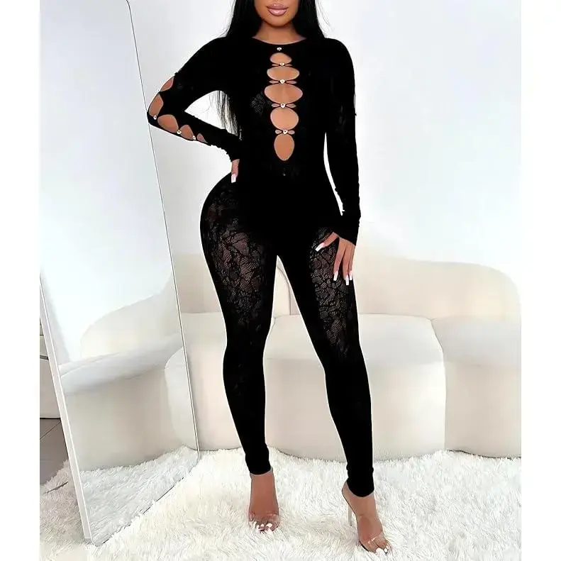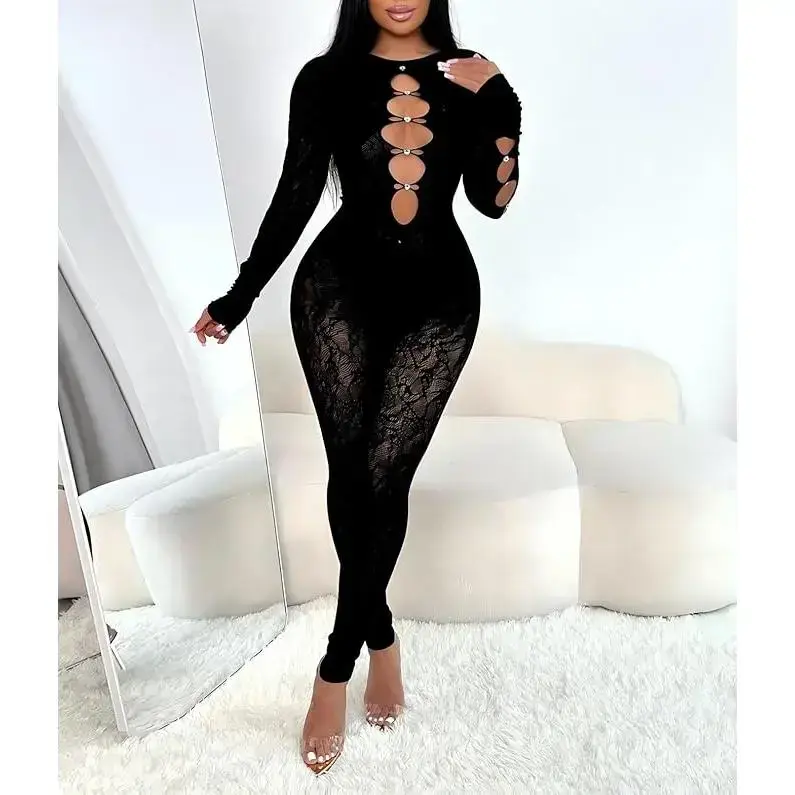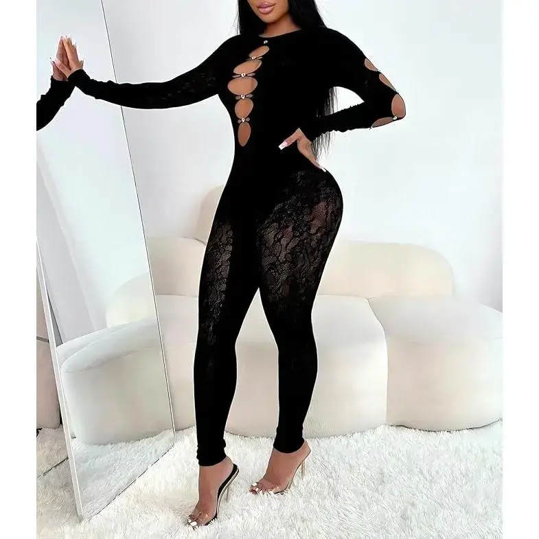 Women’s Sexy Lace Mesh Jumpsuit Rhinestone Hollow Long Sleeve One Piece Bodysuit Club Party Outfits