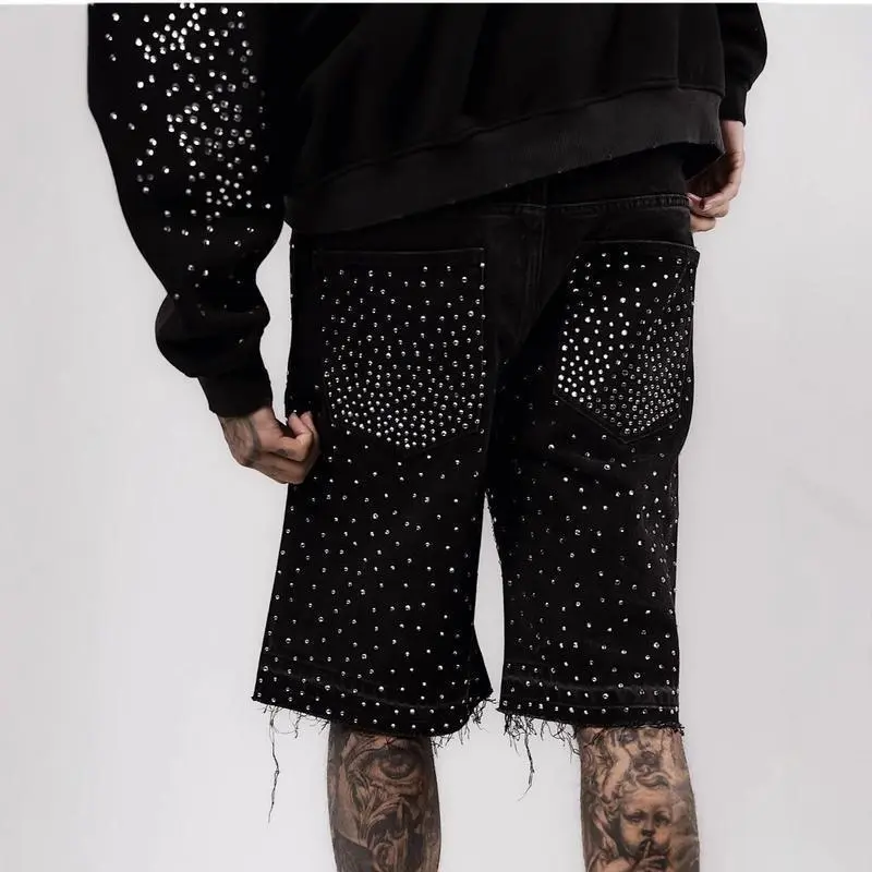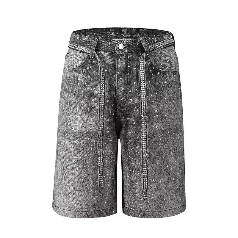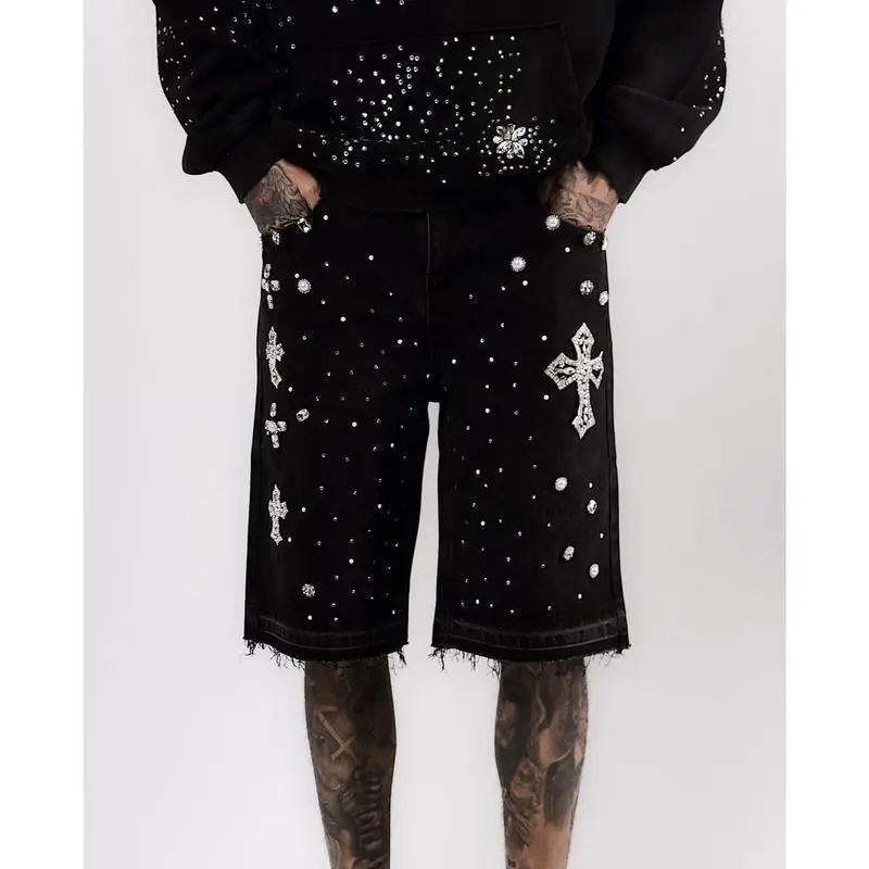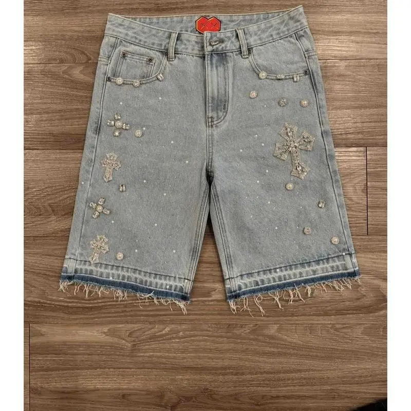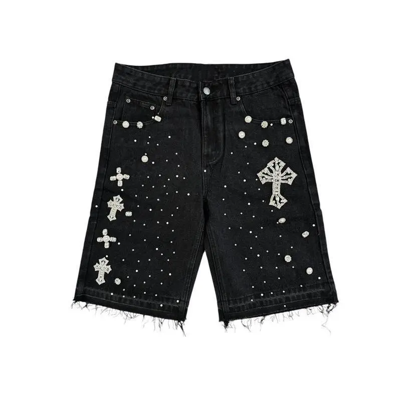 Street Style Hip-Hop Cross Shorts With Diamonds, Straight-Leg Diamond-Studded Five-Point Jeans