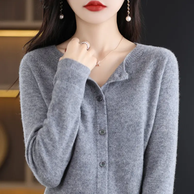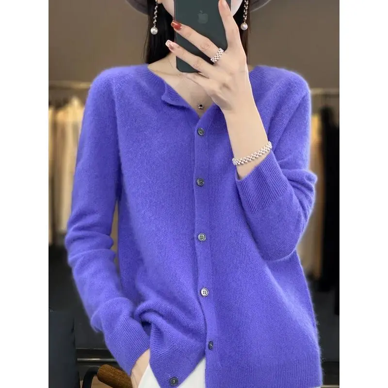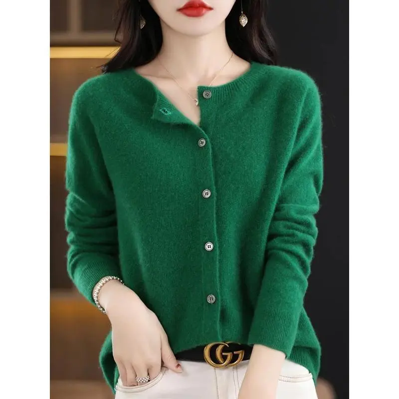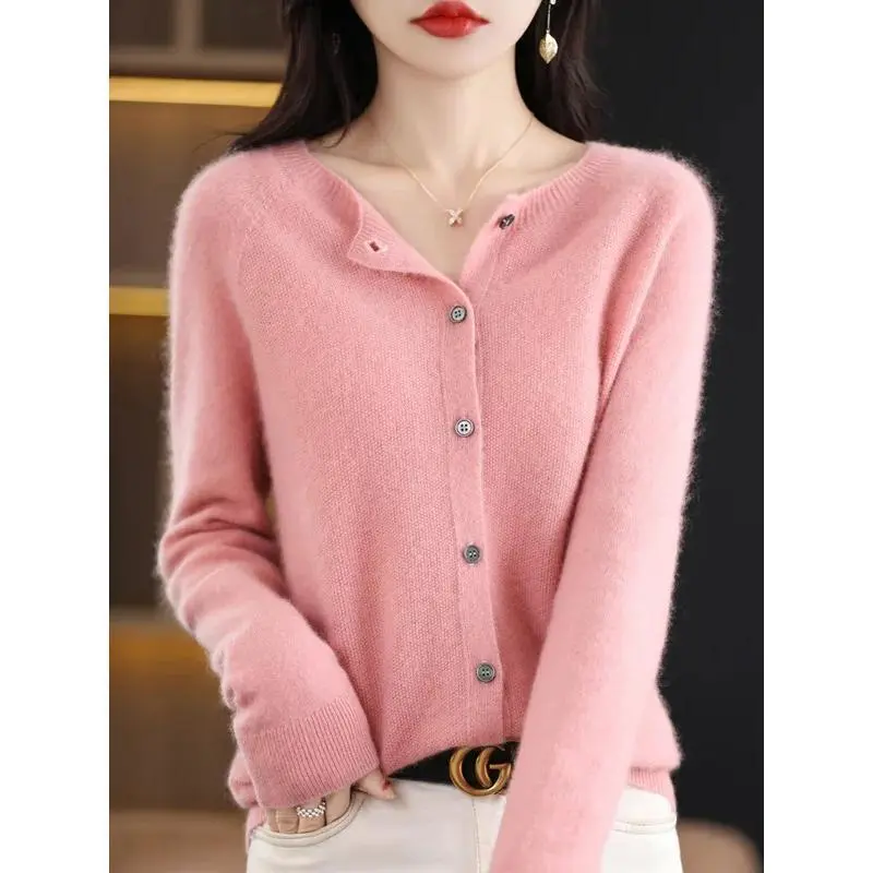 New Fashion Spring 100% Merino Wool Womens O-neck Cardigan Cashmere Sweater 2024 Female Clothing Grace Knitwear Korean Tops