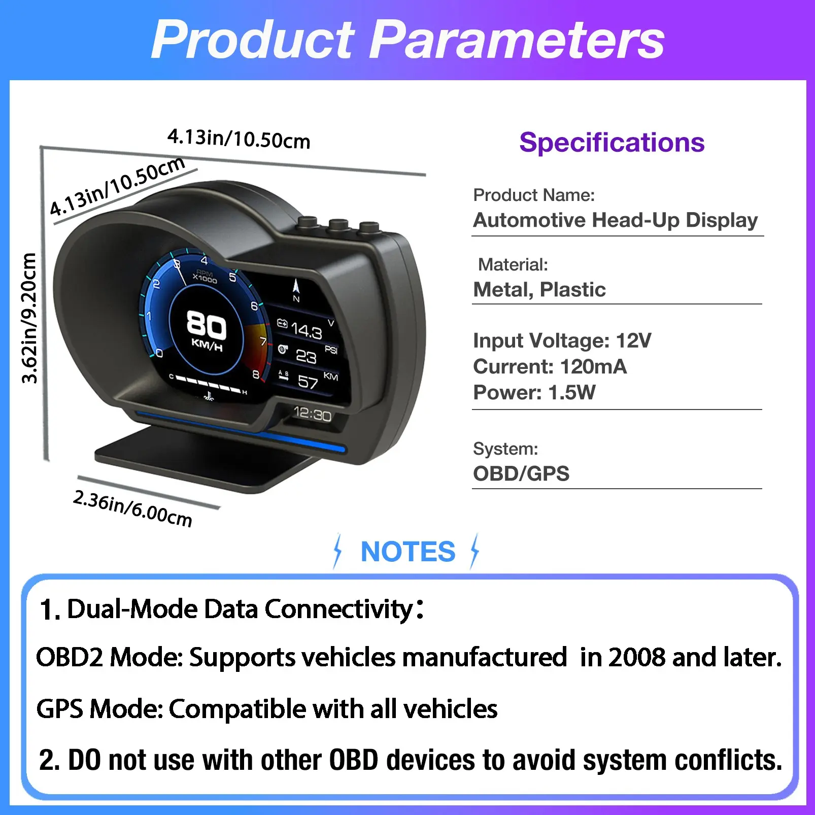 1.Flexible Dual Modes: Switch seamlessly between OBD2 system and GPS speed calculation for versatile driving data.
