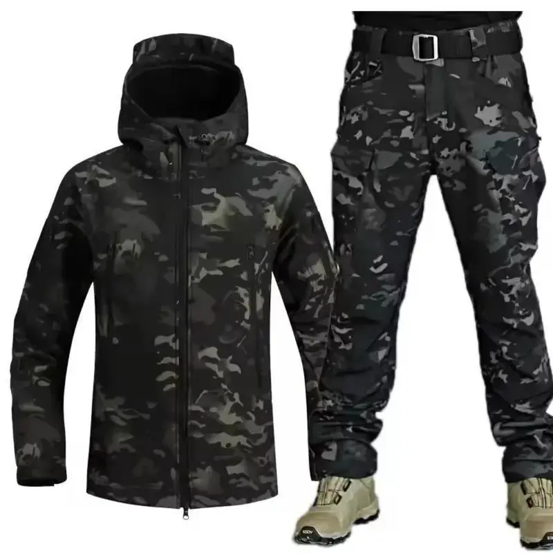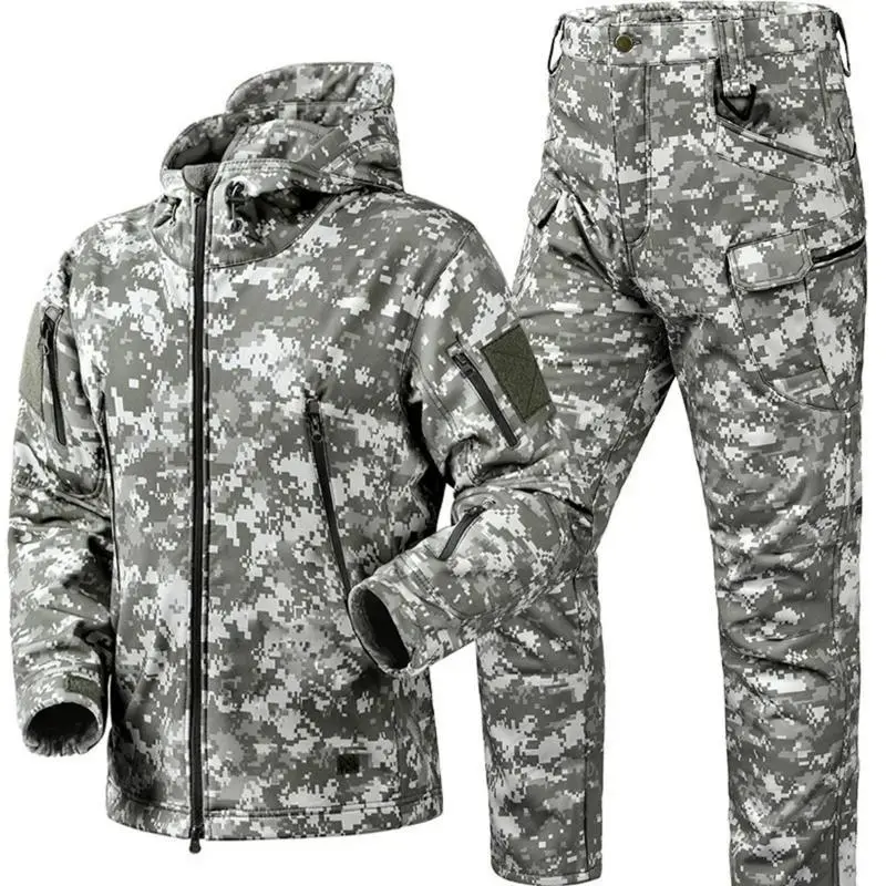 Winter Thicken Men Camo Suit Waterproof Tactical Training Set Multi-pocket Hooded Jacket Fleece Pants Outdoor Hunting 2-piece Autumn winter