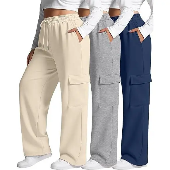 3 Pack Women's Cargo Sweatpants Wide Leg Baggy Loose Elastic Drawstring Pants Casual Athletic Joggers with 4 Pockets