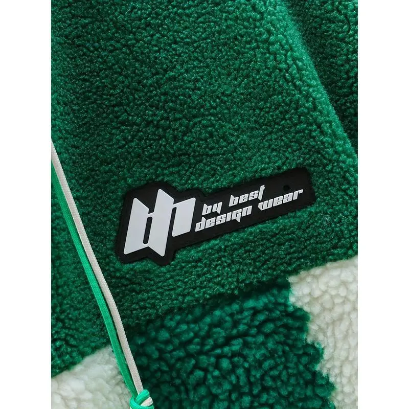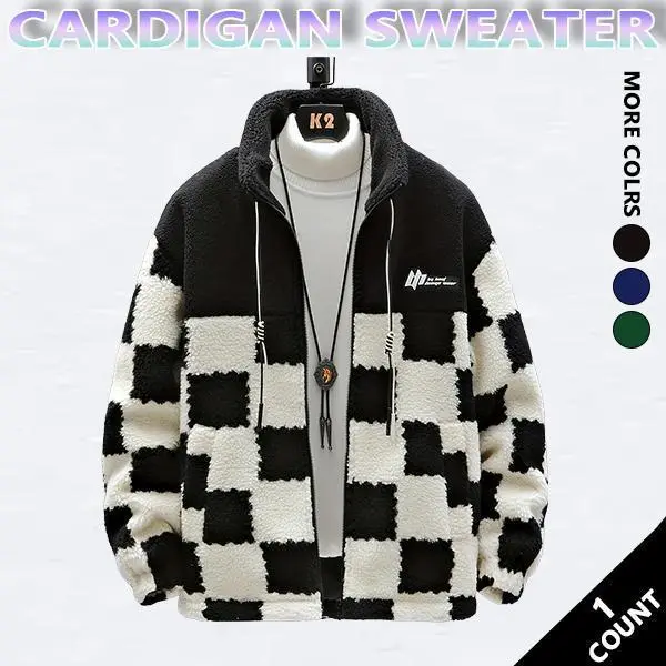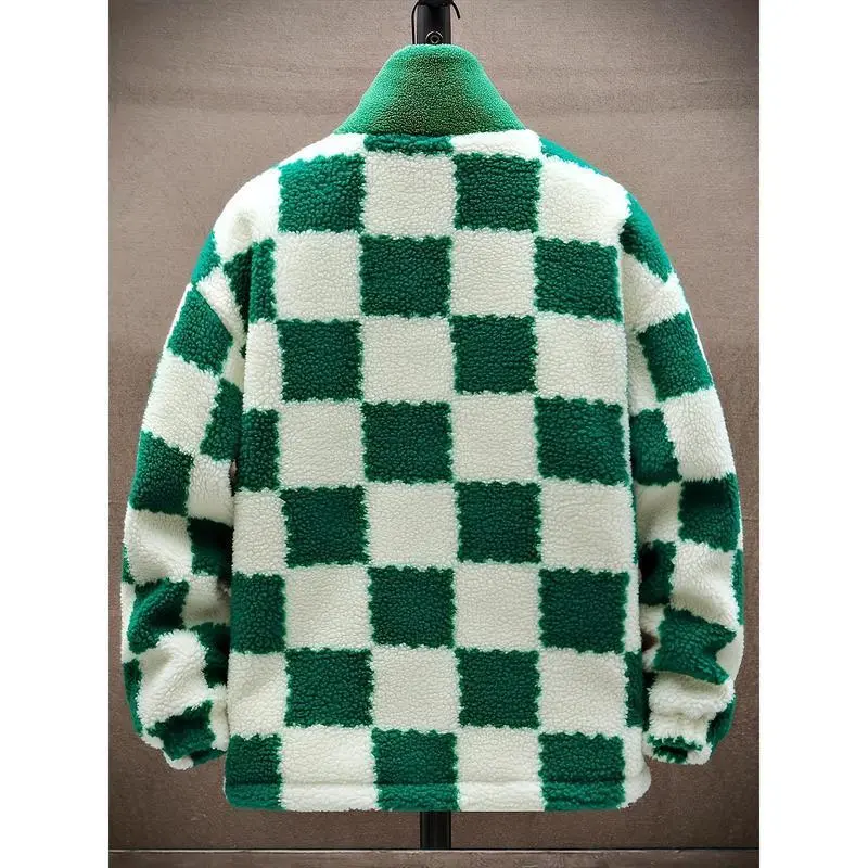 Men's Stylish Winter Warm Polyester Jacket with Cashmere Lining Regular Fit Machine Washable Casual Sportswear Checkerboard Fleece Hoodie Long Sleeve for Cold Weather