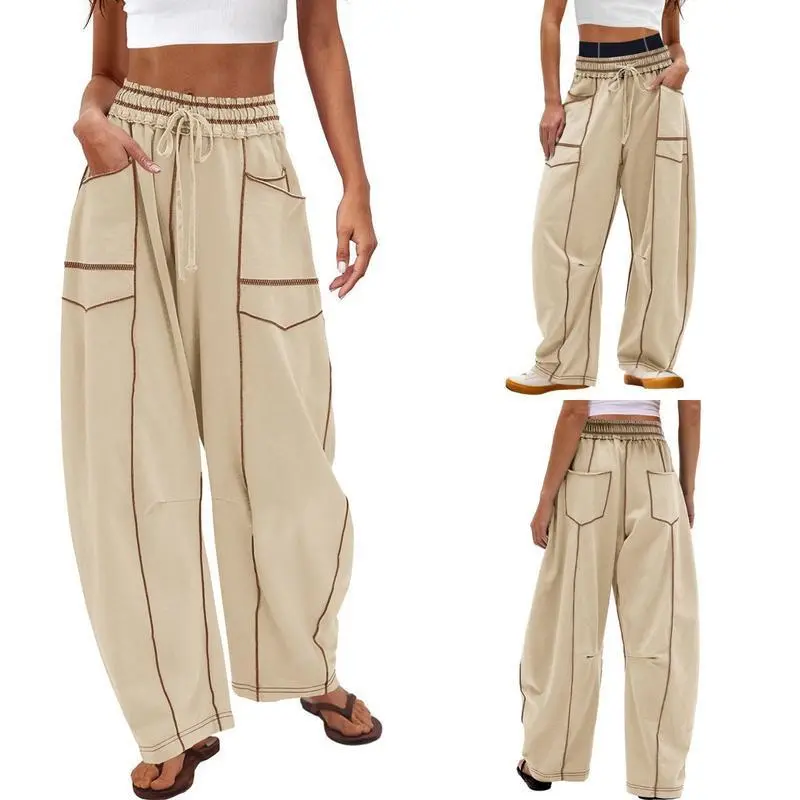 Womens Baggy Barrel Pants Wide Leg Lounge Drawstring Sweatpants with Pockets