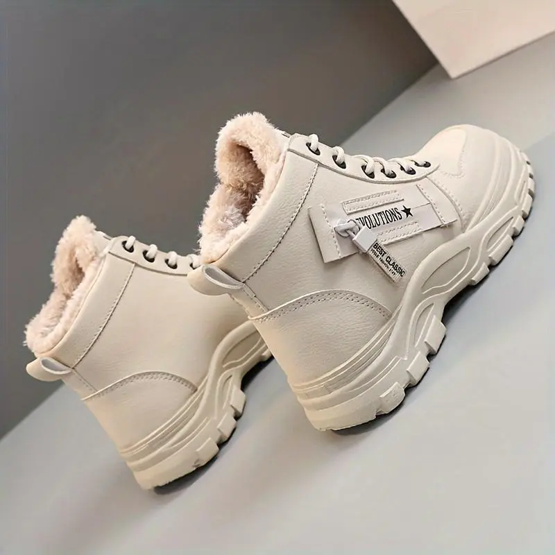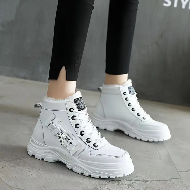 Women'S High-Top Winter Boots - Stylish White Lace-Up with Faux Fur Lining, Waterproof PVC Sole, Casual All-Season Footwear, Casual Winter Boots | Faux Fur Lined Boots | Laceup BootsNew shoes