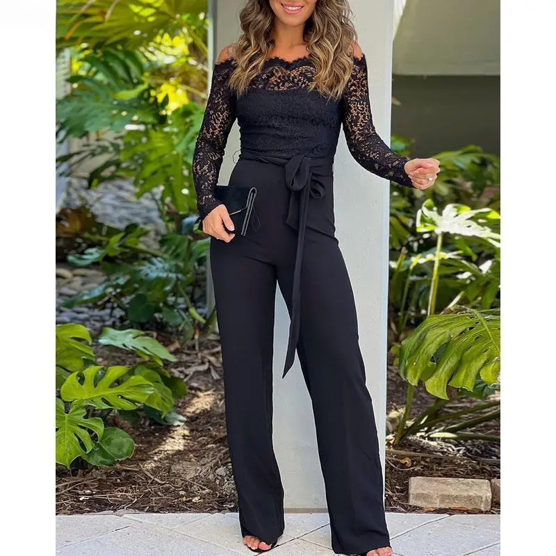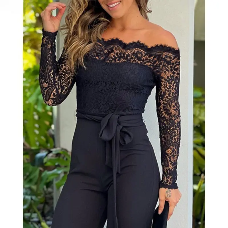 Women's 2025 Off Shoulder Long Sleeve Eyelash Lace Patch Slim Fit Jumpsuit Tied Detail Casual Overalls Elegant Black Fitted Piece