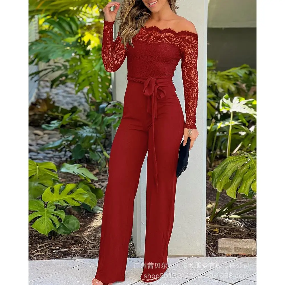 Product Details Style: Casual,Chic Type: Jumpsuit Material: 90% Rayon,10% Elastane Package Include: 1*Jumpsuit (With Belt) Size Guide (Body Measurements for Reference) About this Item Elegant Off-Shoulder Design: Features a chic off-shoulder neckline, beautifully highlighting your collarbones and shoulders for a graceful, feminine look. Delicate Eyelash Lace Patches: The intricate eyelash lace details add a touch of elegance and sophistication, making it a standout piece for casual or semi-formal occasions. Slim Fit Silhouette: Designed with a tailored slim fit, this jumpsuit accentuates your curves for a flattering, streamlined appearance. Adjustable Tied Detail: The tied waist detail allows you to cinch your waist for a customized fit, enhancing your figure while adding a trendy, playful touch.
