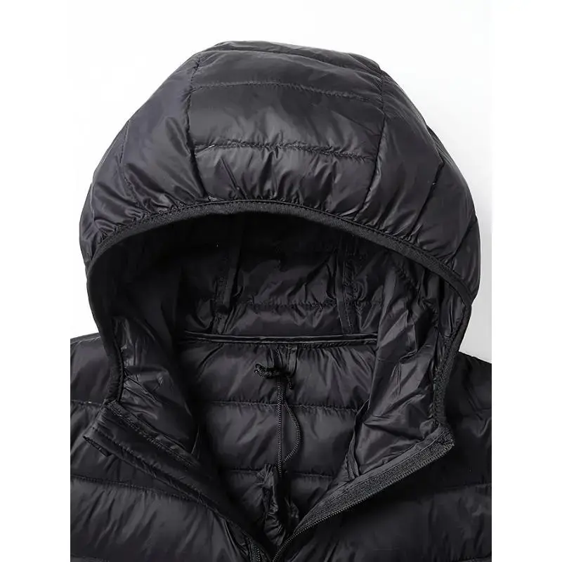 Men's Lightweight Hooded Down Jacket ?Ideal for Winter Outdoor Activities? This men's lightweight hooded down jacket is perfect for winter outdoor activities.It features a waterproof, warm, and cozy design.The casual fit with a zip-up front ensures comfort and style.Made from 100% polyamide, it offers slight stretch for added comfort.The jacket is suitable for fall, spring, and winter seasons.It's a universal fit, ideal for weekend casual wear. Product Details Material: Nylon, 100% polyamide Length: Regular Sleeve length: long sleeve Pattern: Solid color Sheer: No Fabric: Slight stretch Placket Type: Zipper Collar: Hooded Care Instructions Operation Instruction: Hand wash or professional dry clean Lining: Polyamide Filler: White duck down Scenes: Casual Applicable People: Universal Season: Fall, spring, spring/fall, winter Item ID Item ID: XF416209