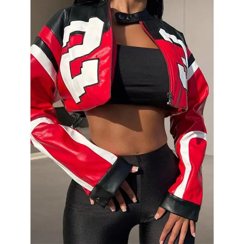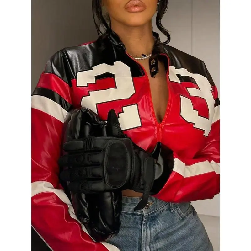 Women's Leather Jacket Cropped Jacket Motorcycle Jacket Y2K Lettering Jacket Women's Faux Leather Jacket StreetwearGIFT7