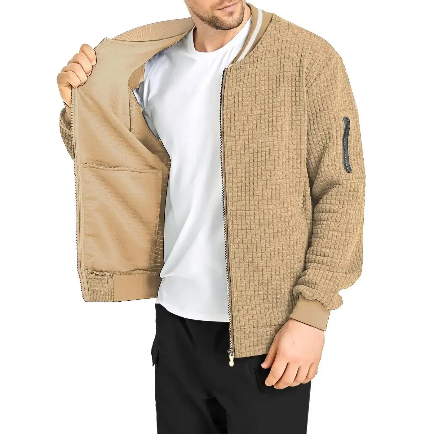 Featured 3D waffle pattern stylish design. Loose Fit: Designed as loose-fitting type.For a Regular Fit, please order ONE SIZE DOWN. Full zip-front closure Two lower side functional pockets and two interior pockets for added storage. Soft, lightweight and high-quality fabric, comfortable and wear well. Suitable for Spring and Fall Perfects for varies occasions: outdoor activities, daily casual life etc. Lightweight Casual Bomber Jacket 3D Waffle Pattern Fabric Featured with 3D waffle pattern quilted design, a eye-catcher, giving this jacket stylish and unique sense. Men's Lightweight Varsity Bomber Jacket Details A classic men’s casual jacket, Soft, lightweight, comfortable and wear well, and never out of date.